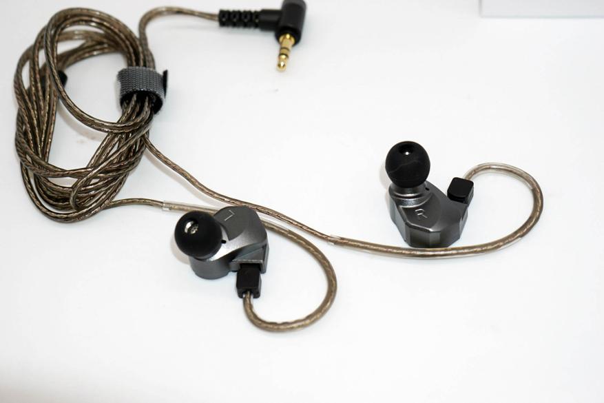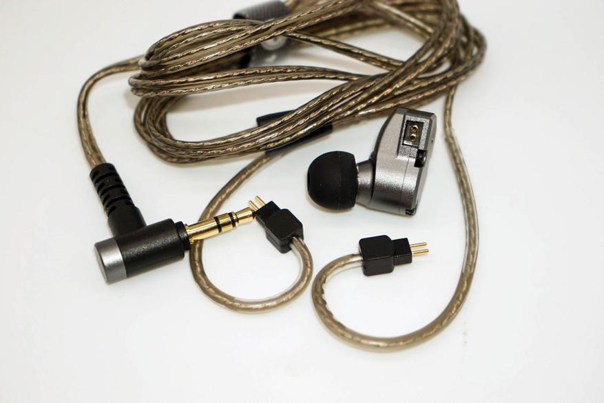 В комплекте с наушниками поставляется аудиокабель с разъемом 2-Pin, сменного типа, витой в оболочке. При необходимости можно будет подобрать и сменить сам кабель, оставив наушники. На мой взгляд, такой вариант удобнее, чем припаянный провод внутри корпуса наушников, так как сталкивался с моментами, когда пришла пора заменить кабель, наушники нравятся и выбрасывать их было бы жаль. В этом случае просто будет достаточно заменить кабель на новый.
