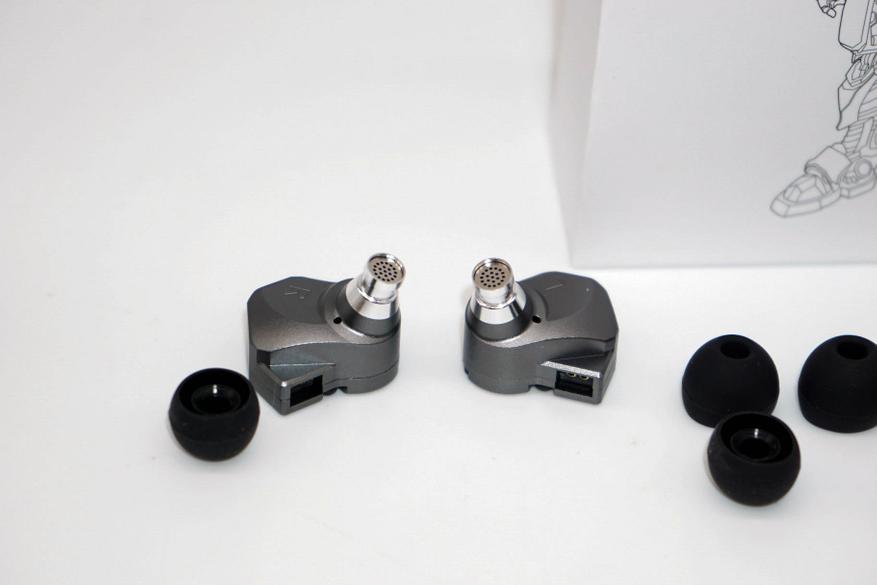 Пара слов про амбушюры. В комплекте их аж шесть пар: одна пара средних (универсальных) установлена сразу на корпус наушников, а еще пять пар находятся в комплекте. Амбушюры черного цвета, эластичные, не создают дискомфорт при длительном ношении. Самое главное — подбирайте по размеру и для комфортной посадки. Отмечу металлическую защитную пластину с отверстиями, отделяющую динамический драйвер от внешнего пространства. Эту пластину хорошо видно на фотографии со снятыми амбушюрами.