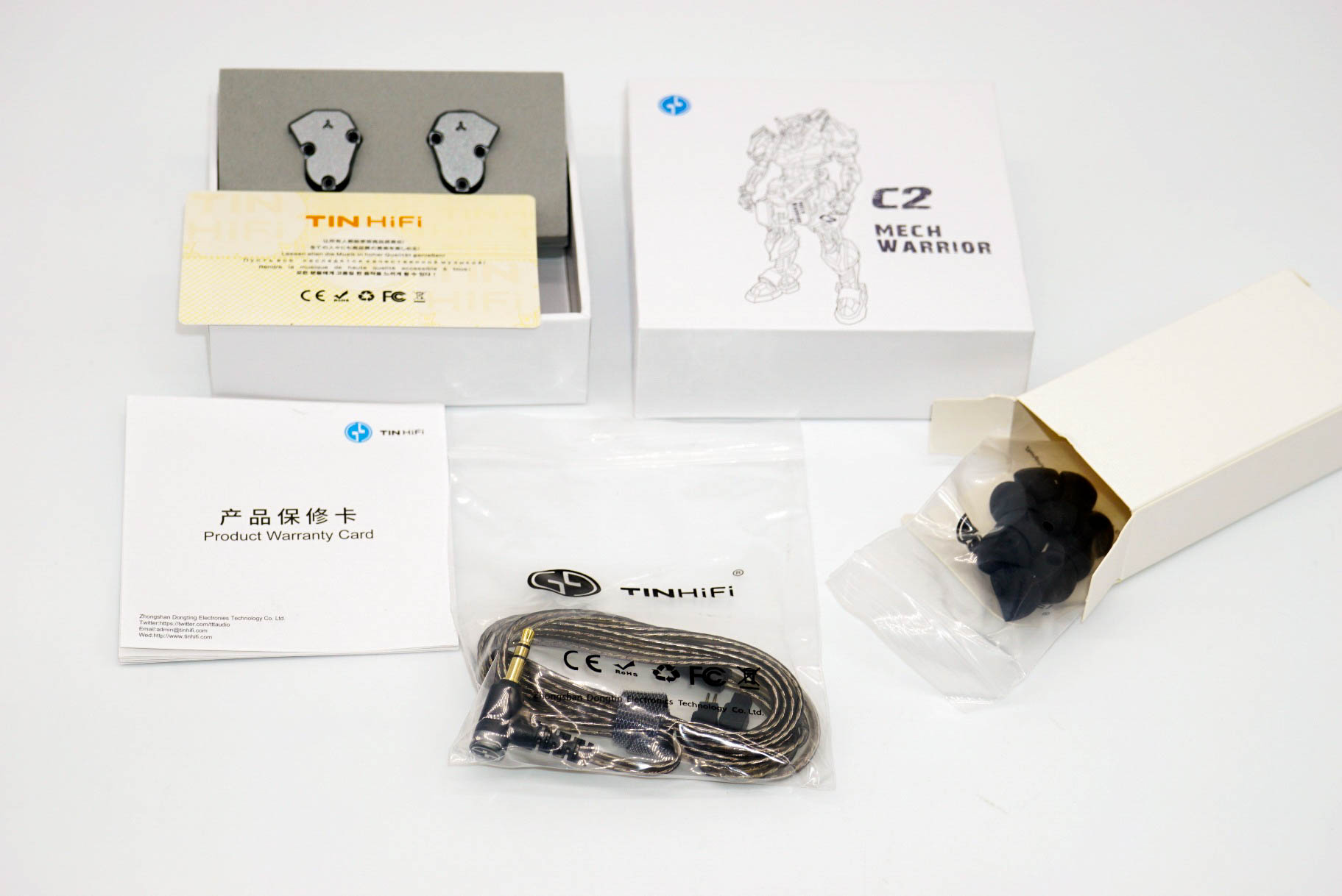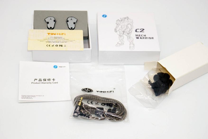 TinHiFi C2 Mech Warrior поставляются в совсем скромной картонной коробке с полимерным мягким подиумом, отдельно упакованным кабелем и комплектом амбюшур. Отмечу гарантийный талон и благодарственный листок в упаковке, а также небольшую липучку-органайзер на кабеле, которую можно снять, а можно использовать по назначению.