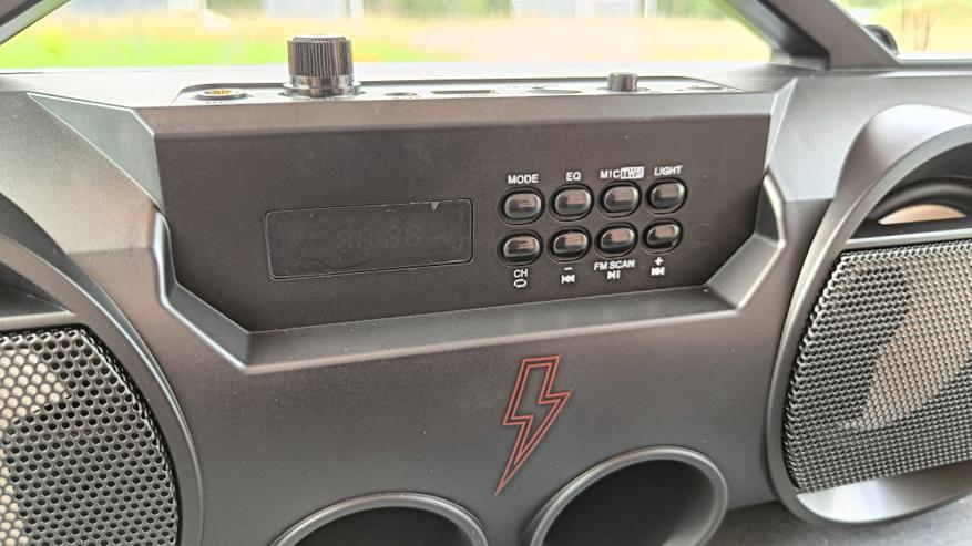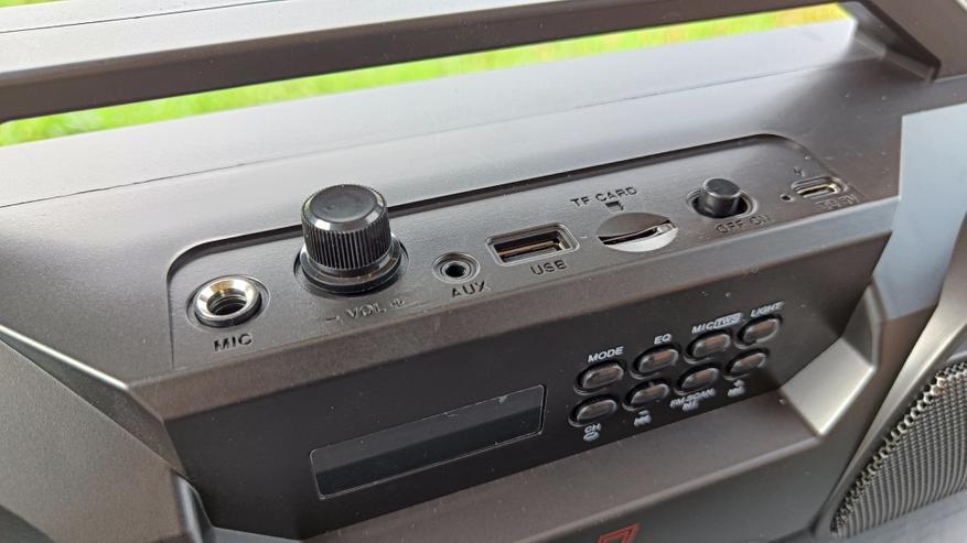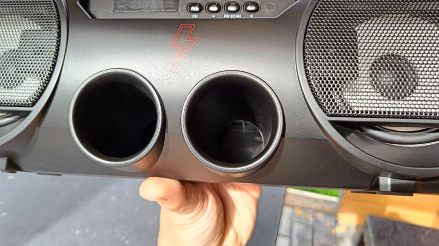 Напомню, что вывод звука построен на двух 100 мм широкополосных динамиках. Им в дополнение идут два фазоинвертора с выходом под кнопками управления. И несмотря на размеры динамиков, номинальная мощность по заверению производителя составляет всего 12 Вт. Тогда как на многих китайских колонках используются динамики значительно меньших размеров, но с большой мощностью. Для более качественной выдачи звука следует поработать со встроенными эквалайзерами. Мне больше всего понравились настройки Jazz и Pop, где более выражены высокие и низкие частоты. Можно сказать, что основной частотный диапазон колонки направлен на средние частоты, но поиграясь с эквалайзерами, можно получить сочные ударные и звонкие высокие нотки. Тем более для низких частот предусмотрены фазоинверторы. Хотя, как мне показалось, объем колонки слишком большой, чтобы прокачать его установленными динамиками.