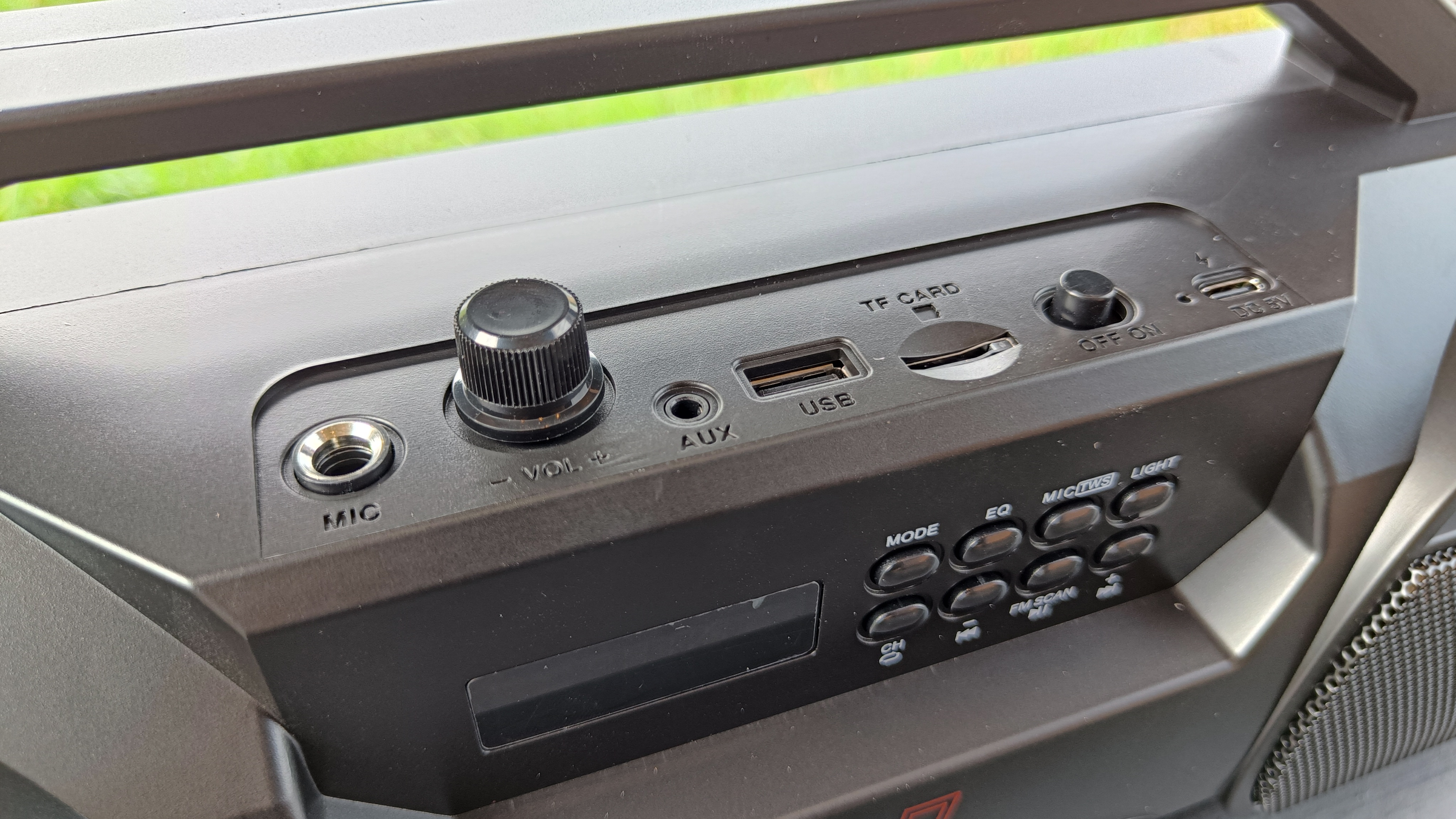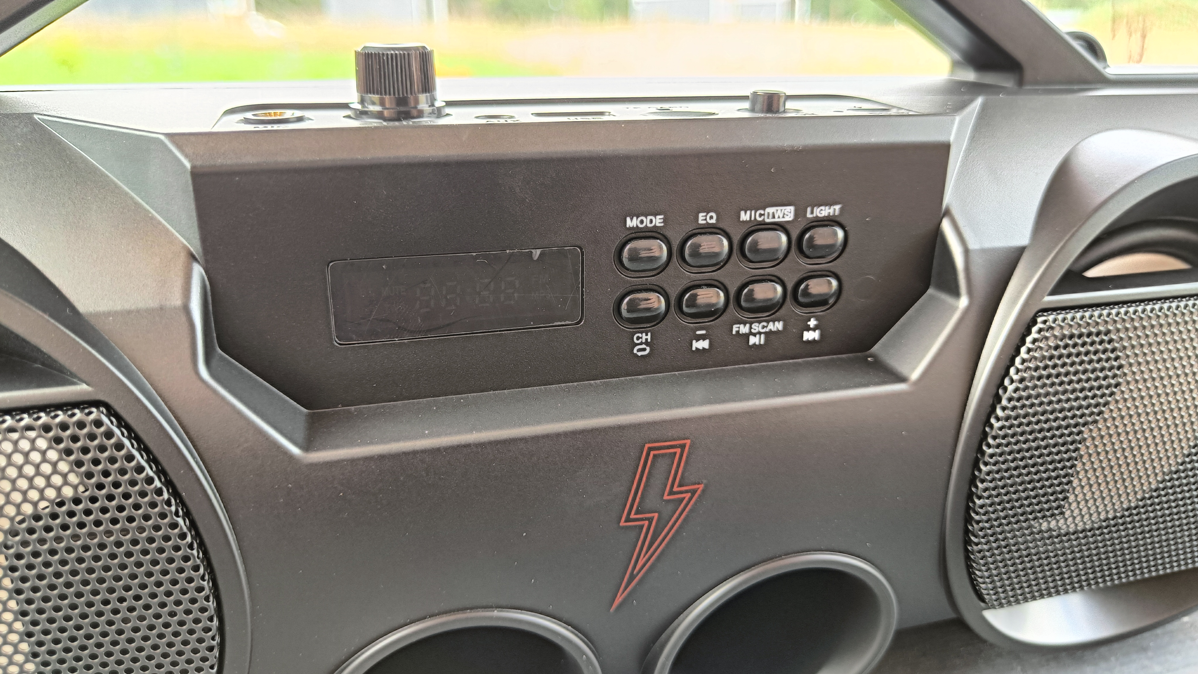 Все управление вынесено на лицевую часть. Это большое количество различных кнопок, «крутилок» и даже есть небольшой экран. Кнопки все подписаны и разобраться в их назначении не составит труда. 100 мм динамики разнесены по разным сторонам и прикрыты металлической сеткой. Между ними вынесены 2 массивных фазоинвертора, добавляющих «тяжелых» ноток во время воспроизведения музыки.