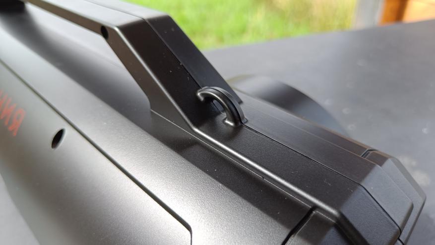 Урал Молния 280 выполнена в черном пластмассовом корпусе. Стенки достаточно плотные и не прогибаются от нажатия. На верхней части установлена массивная ручка для удобства перемещения. А по краям от ручки можно увидеть небольшие петли для установки ремешка, которого в комплекте не оказалось.