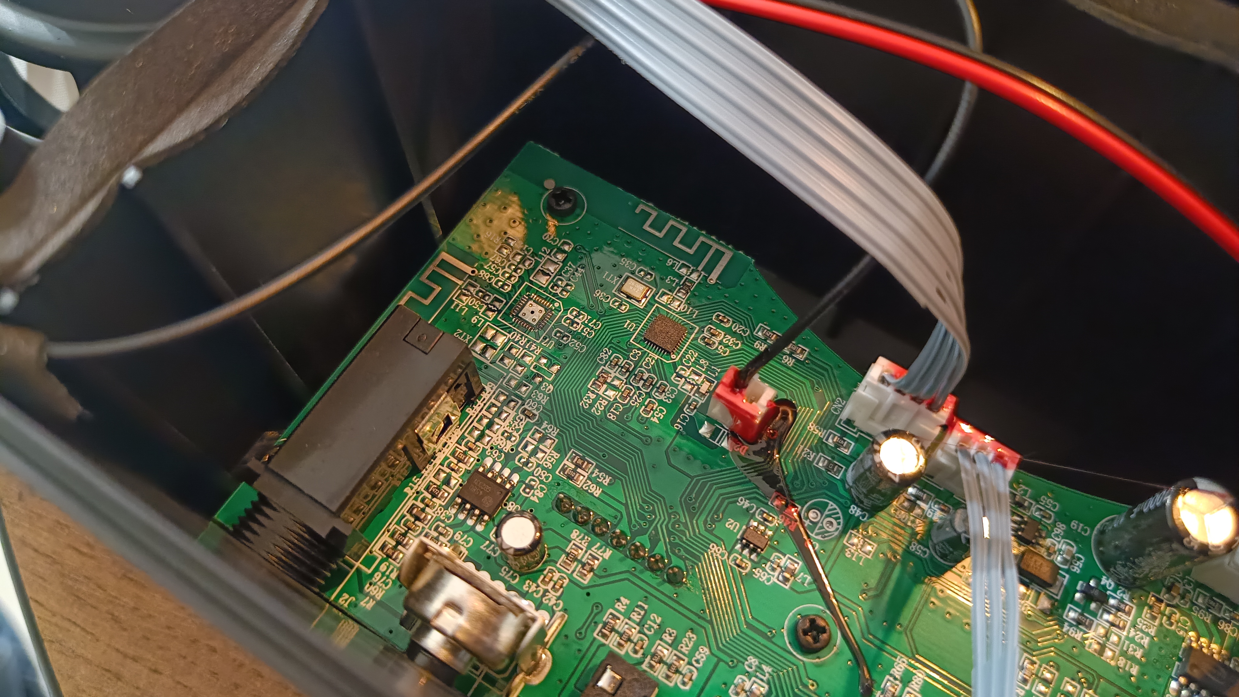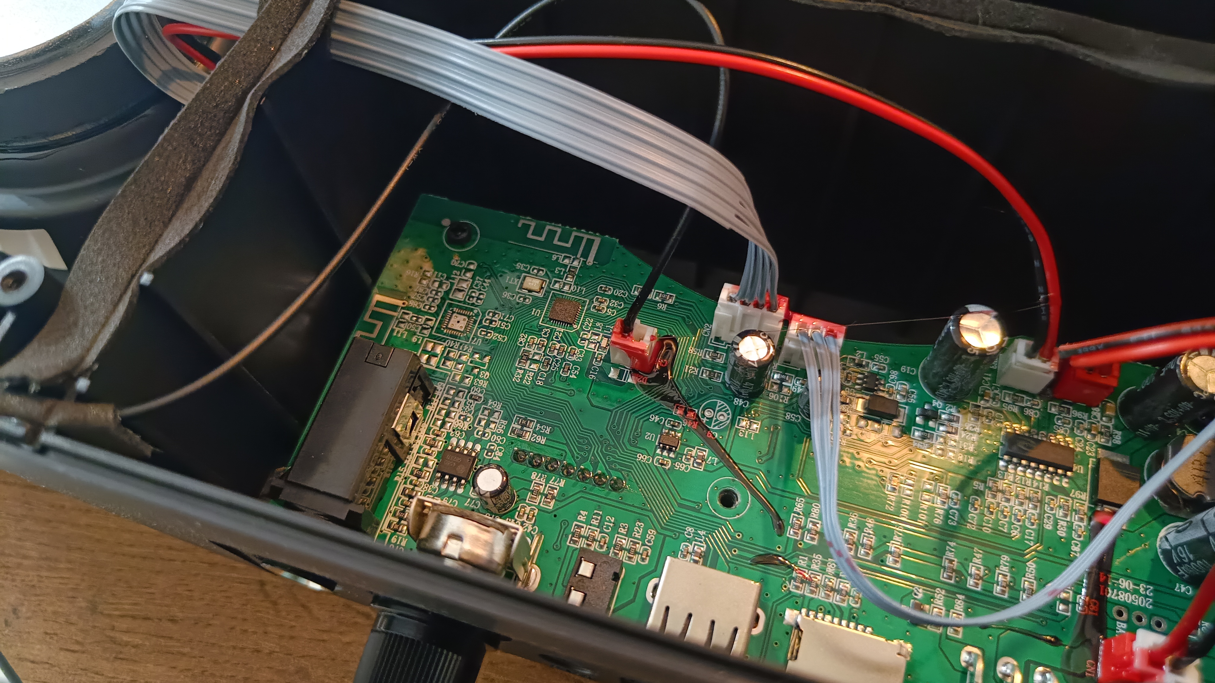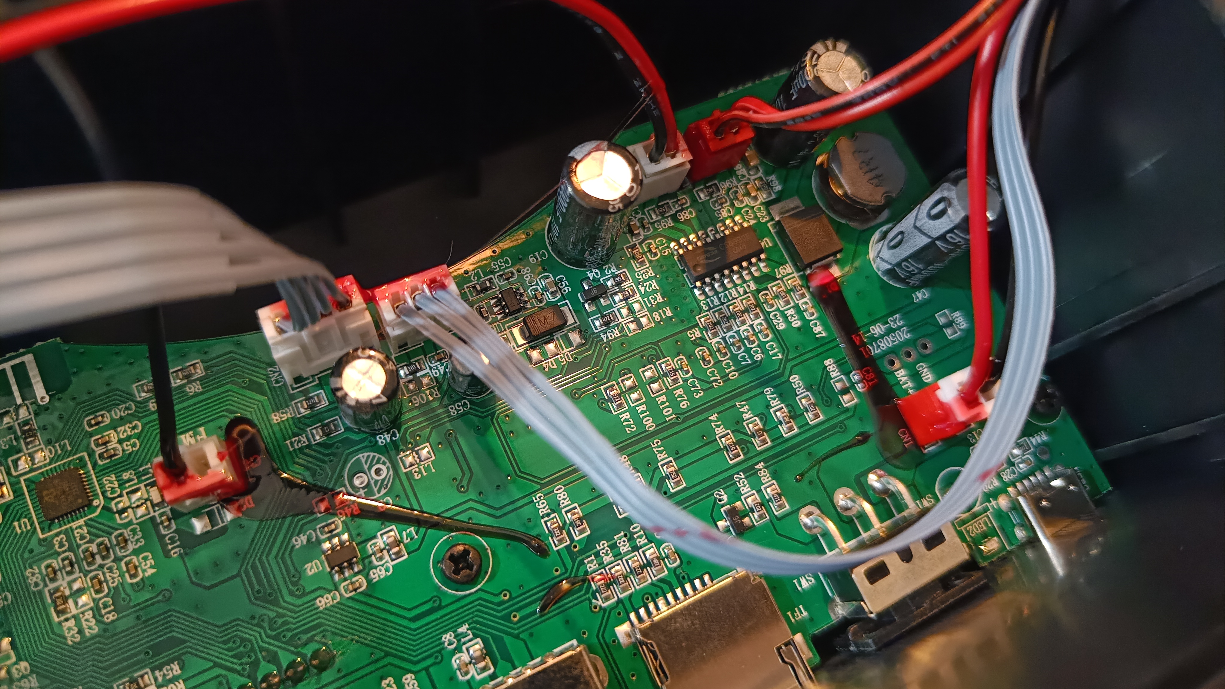Все же мне стало интересно, что находится внутри и соответствуют ли заявленные характеристики. Разбирается корпус довольно просто, он собран на обычных саморезах. Но внутри можно увидеть, что плата управления находится в отдельном отсеке и изолирована уплотнителем. Монтаж элементов выполнен довольно хорошо, аудио каналы выведены на отдельные разъемы. И еще пролиты клеем, чтобы не отошли во время эксплуатации.