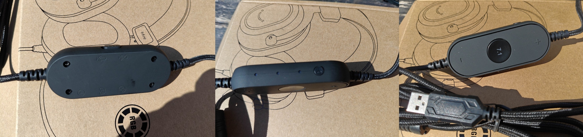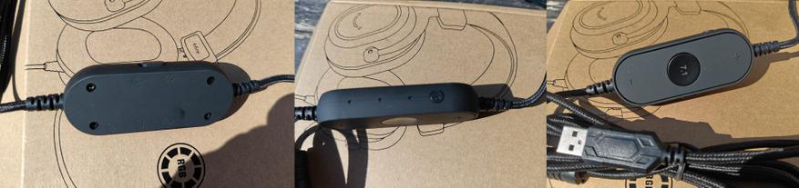 Интерфейсный кабель имеет длину около 2х метров и имеет тканевую оплетку, ближе к usb разъему есть ферритовое кольцо. Где-то на трети длины, ближе к наушнику, находится блок управления гарнитурой. В корпусе данного блока находится звуковая карта, которая обеспечивает тот самый пространственный звук, и органы управления.