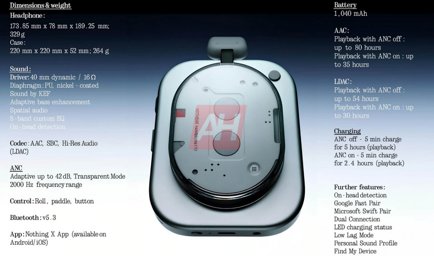 Наушники будут весить 329 граммов. Для сравнения, премиальные Apple AirPods Max весят 384 грамма. Стоит отметить, что Nothing не заявляет о превосходстве своих наушников над AirPods Max, акцентируя внимание на собственных уникальных особенностях. Что касается звука, наушники будут оснащены 40-миллиметровыми драйверами. Важным аспектом является то, что компания сотрудничала с британским аудиобрендом KEF для настройки звучания, который разрабатывает и производит аудиооборудование, специализируясь на динамиках, сабвуферах и наушниках. Как заявляет производитель, при выключенном ANC новинка сможет работать до 80 часов от одного заряда, что является выдающимся показателем. С включенным ANC время работы сокращается до 35 часов при использовании кодека AAC. Если пользователь выберет высококачественный аудиокодек LDAC, автономность изменится следующим образом: 54 часа без ANC и 30 часов с ANC. Наушники поддерживают Google Fast Pair для быстрого сопряжения с Android-устройствами, а также Microsoft Swift Pair для легкого подключения к устройствам на Windows. Функция Dual Connection позволит одновременно подключать наушники к двум устройствам. Nothing (1) также предложат обнаружение на голове (автоматическая пауза при снятии), светодиодный индикатор состояния зарядки, режим малой задержки для игр, персональный звуковой профиль для индивидуальной настройки звучания и функцию Find My Device для поиска потерянных наушников. Официальная презентация новинок от компании Nothing запланирована на 1 июля, где будут раскрыты все оставшиеся детали и цены.