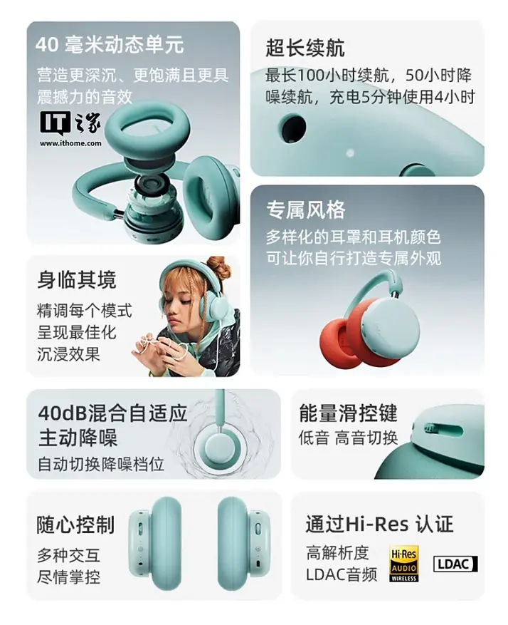 Технические характеристики включают 40-миллиметровые динамики с никелированной диафрагмой, гибридное адаптивное активное шумоподавление до 40 дБ, поддержку пространственного звука и прозрачного режима передачи звука. Наушники поддерживают одновременное подключение к двум устройствам и работают с аудиокодеками AAC, SBC и LDAC. Модель получила двойную сертификацию Hi-Res как для беспроводного, так и для проводного режимов работы.