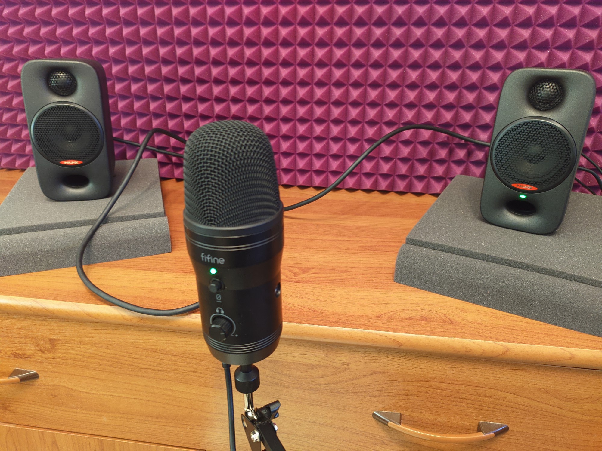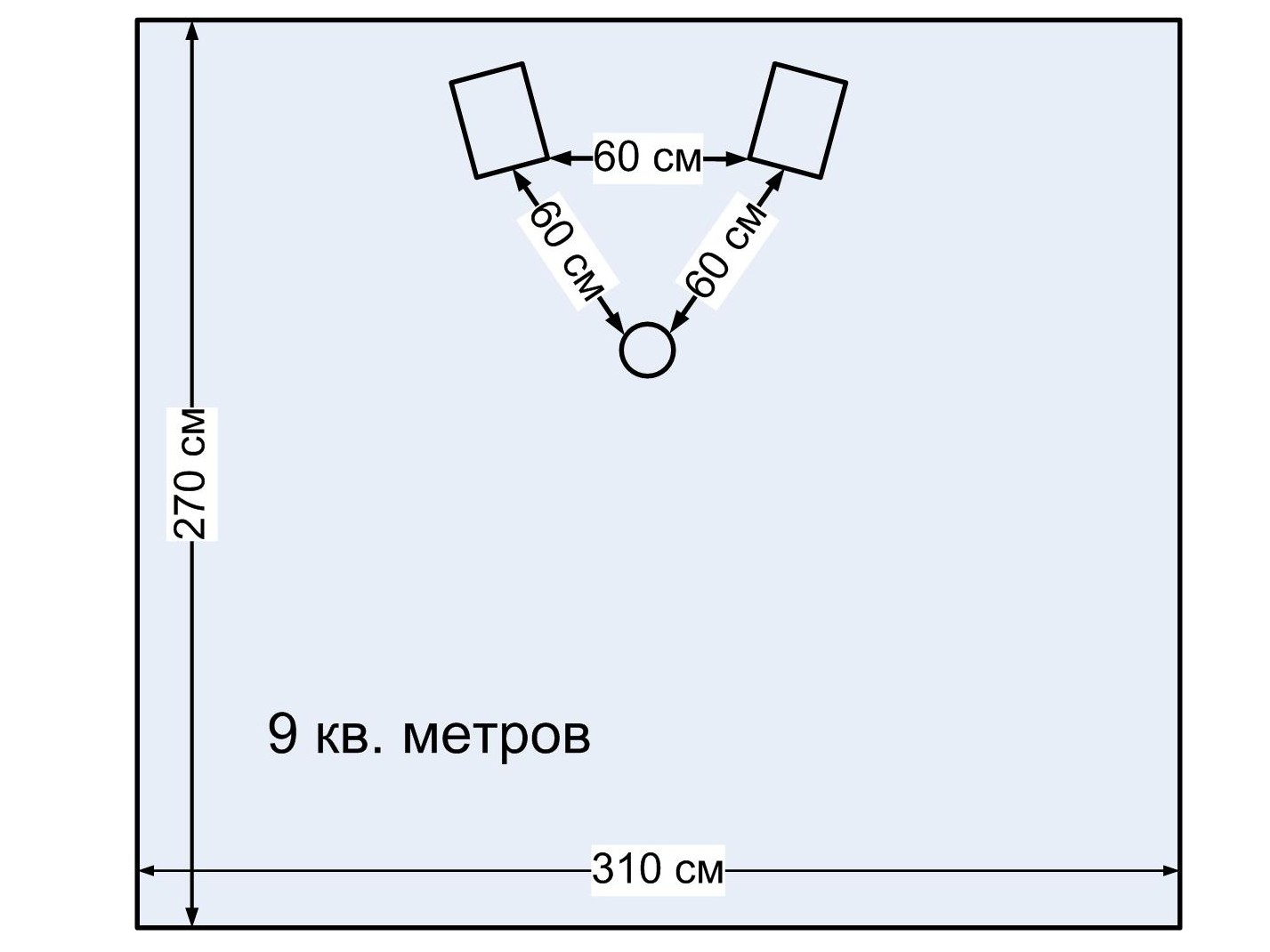 Я сделал запись теста звука, но уже микрофоном Fifine K690 с функцией стерео. Мониторы были расположены на расстоянии друг от друга в 60 см, микрофон также в 60 см от каждой колонки. Получился равносторонний треугольник с длинной стороны 60 см. Такие расстояния примерно соответствуют использованию мониторов с ноутбуком, но в расположении на одной плоскости, без вертикального угла. Мониторы от стены были расположены на расстоянии 10 см. Комната у меня 9 квадратных метров, и в таком помещении AXON 3 отлично раскрываются по низким частотам. Комната немного подготовлена. Всего на стенах 6 квадратных метров акустического поролона и по углам пара не очень эффективных басовых ловушек. Схема расположения мониторов и микрофона сделана в масштабе, и все расстояния на схеме соответствуют реальным.
