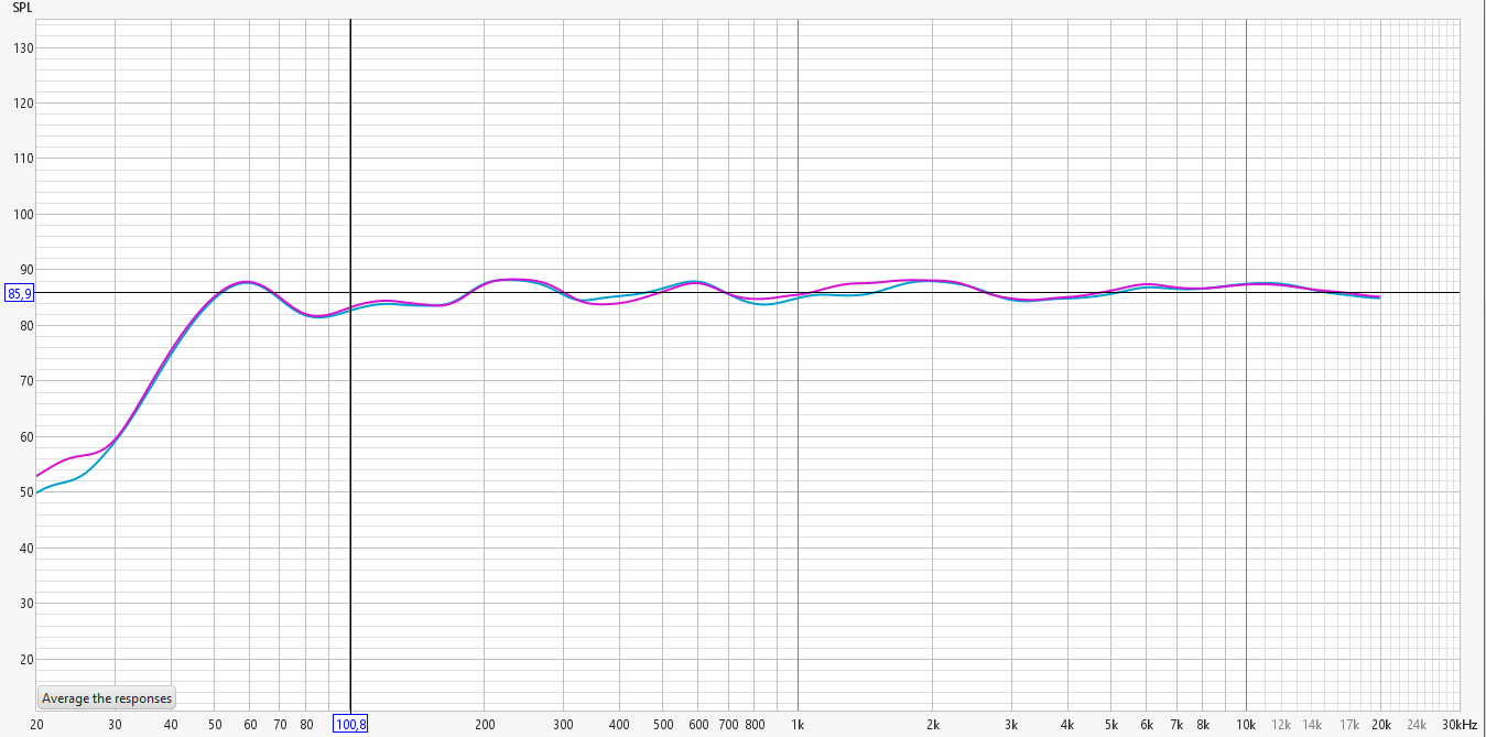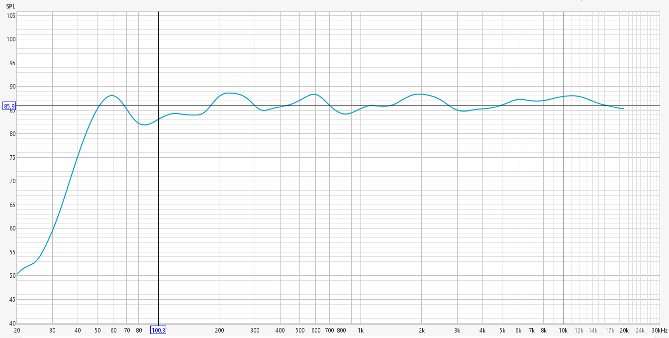 В условиях моей небольшой комнаты всего на 9 квадратов, на расстоянии задней части колонок от стены в 50 см и расстоянием в 80 см от излучателей до измерительного микрофона Behringer ECM8000, замер показывают линейность +/- 3 дБ где-то на 48 Гц. Вот что значит акустика помещения. Обратите внимание, что горизонтальный масштаб с замером одной колонки больше, чем у графика для левой и правой. Я специально сделал для второго графика масштаб поменьше, как делают производители для своих маркетинговых графиков, чтобы подчеркнуть линейность.