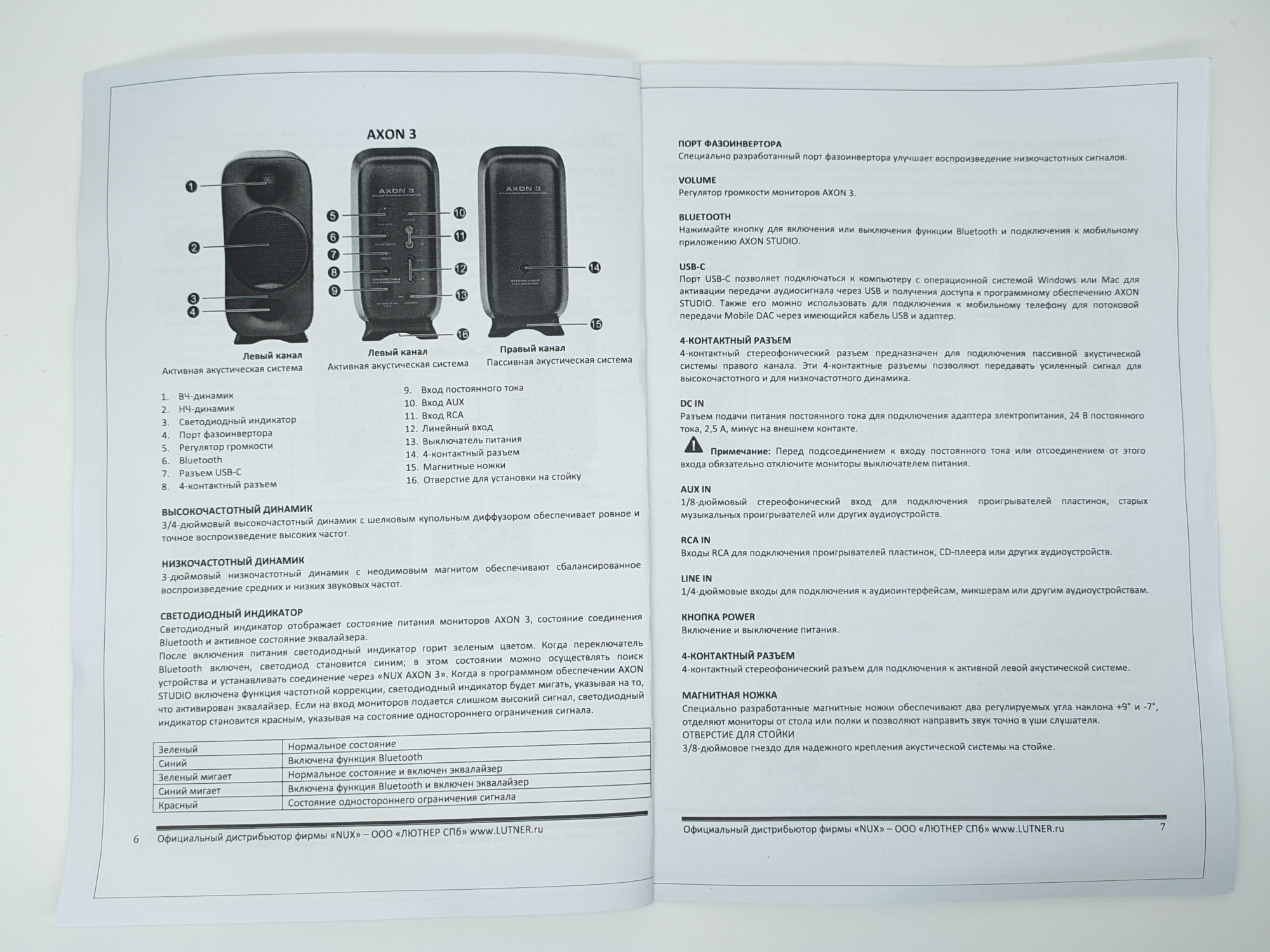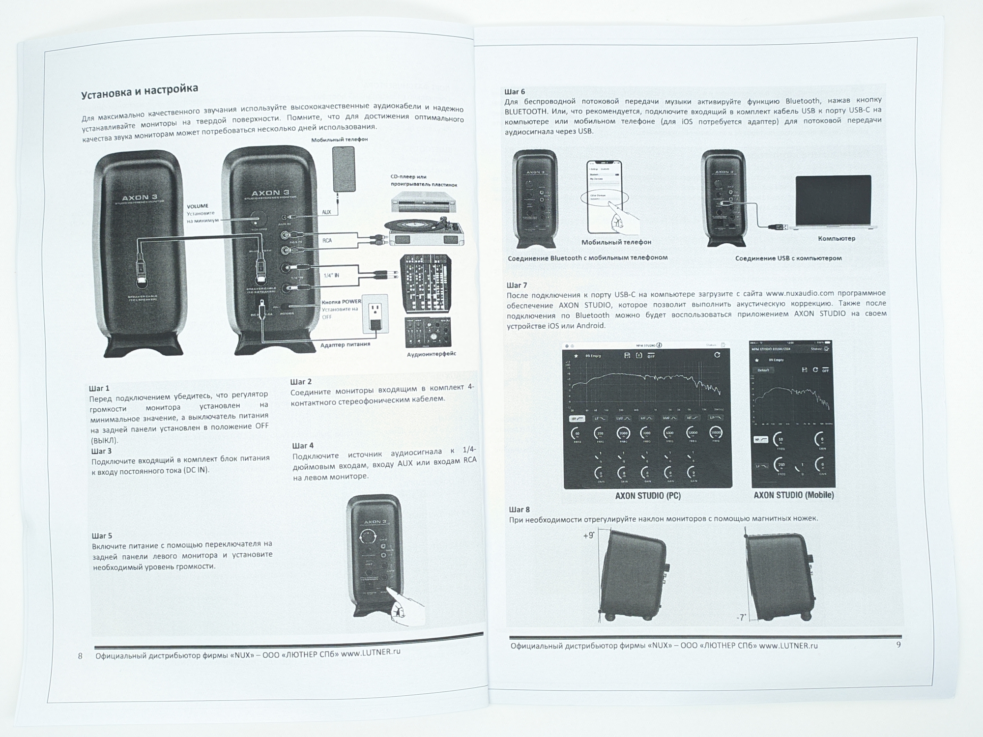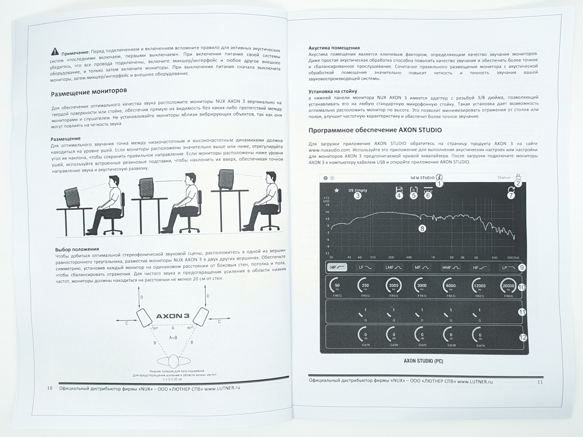 По традиции девайс изучается методом тыка, а инструкцию открываем, если что-то пошло не так. С AXON 3 в целом всё интуитивно понятно, но инструкция в комплекте есть. Правда, судя по приклеенной к левой колонке этикетке, у меня дилерская версия мониторов, и, возможно, это они добавили инструкцию. Это распечатанная версия инструкции с официального сайта, и она действительно очень подробная.