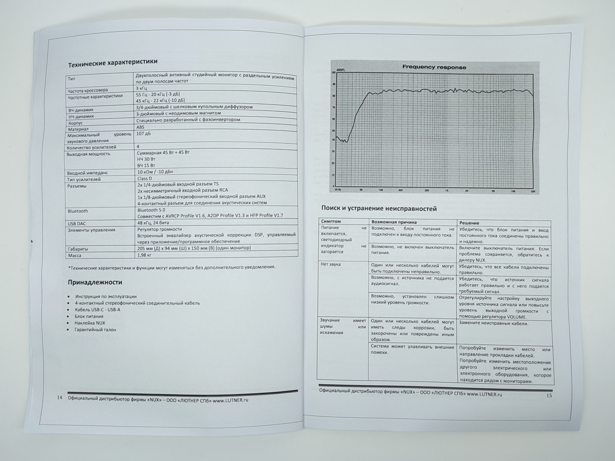 Вот такой замер нам предоставили сами производители, и по нему всё очень хорошо. Есть заявленная линейность, но AXON 3 в заявленные +/- 3 дБ от 55 Гц по этому графику не вписываются. Не знаю, как делали замер NUX, но предполагаю, что это была либо большая, либо «глухая» комната и мониторы стояли ближе к ее центру, чем к стене.