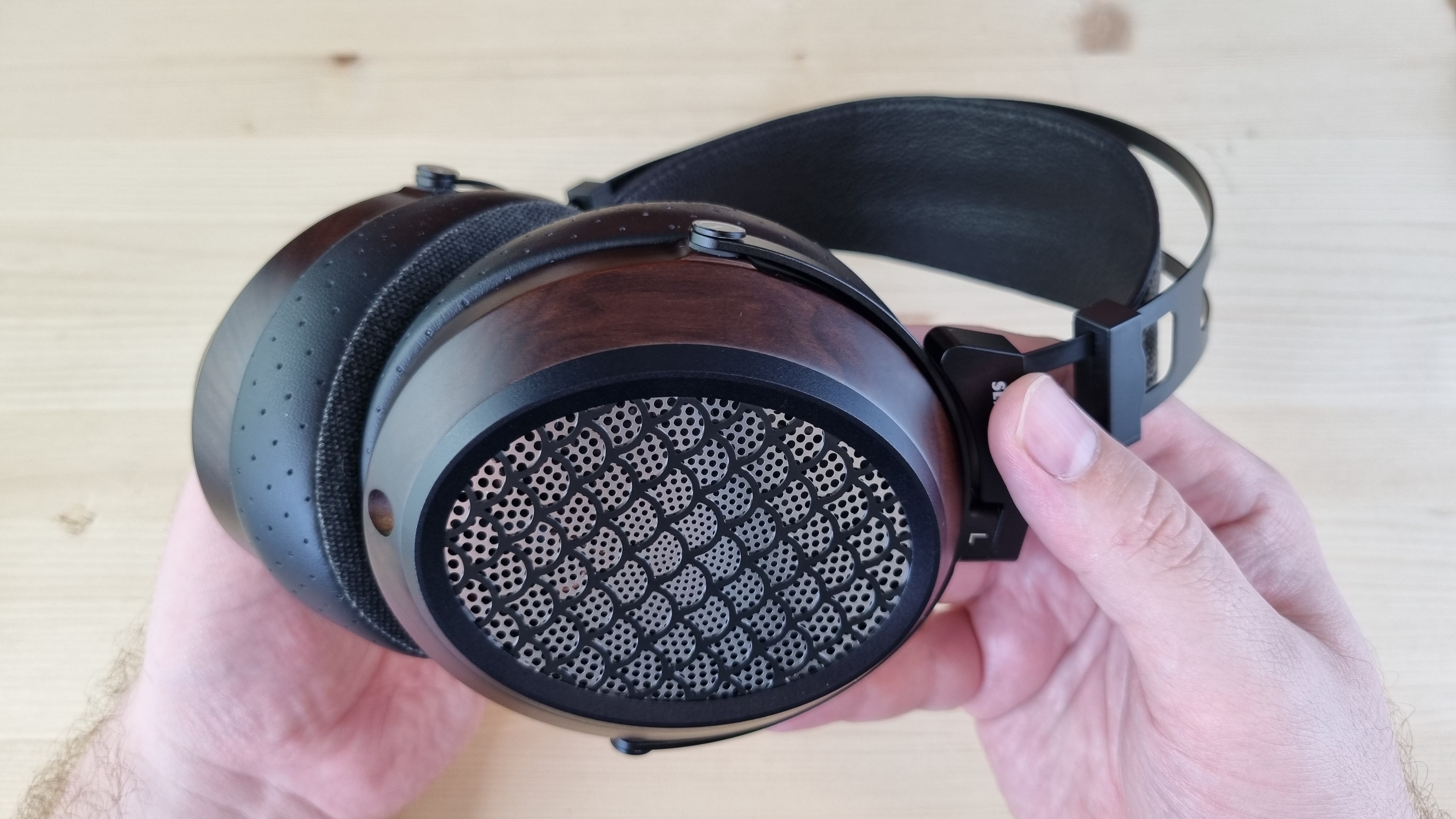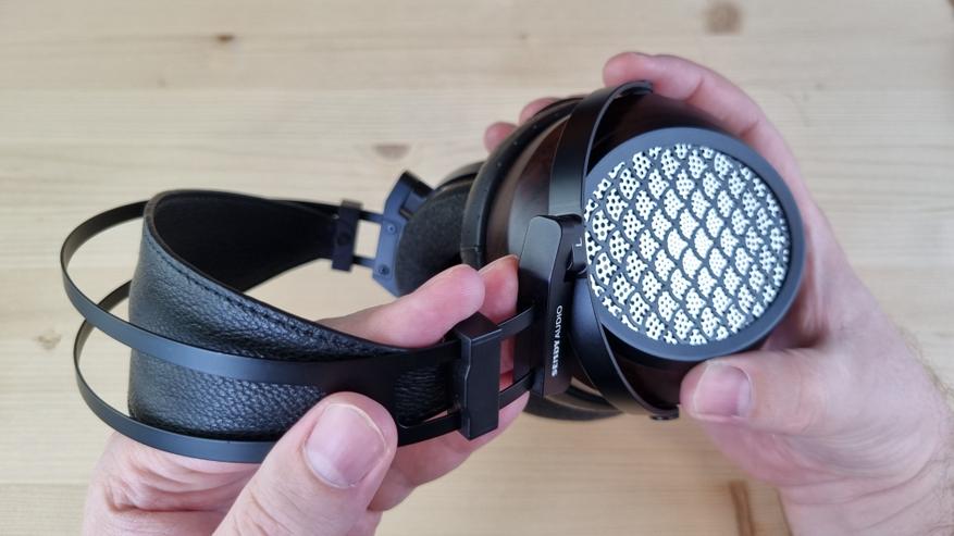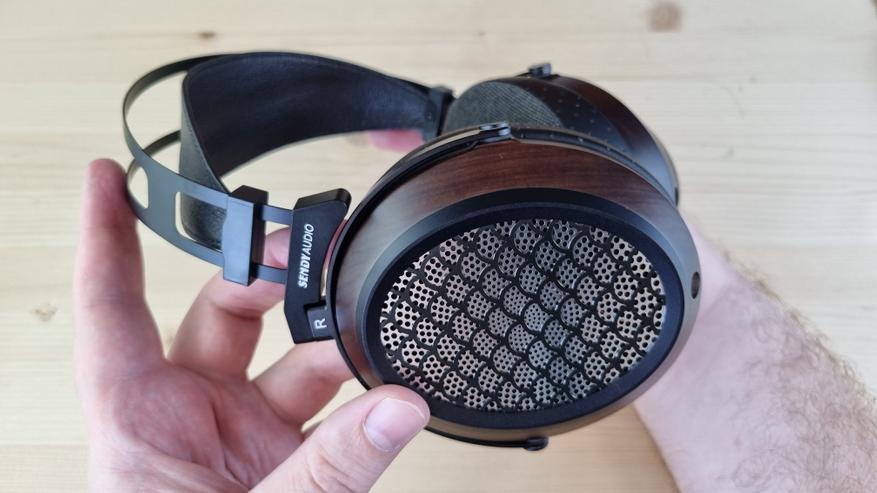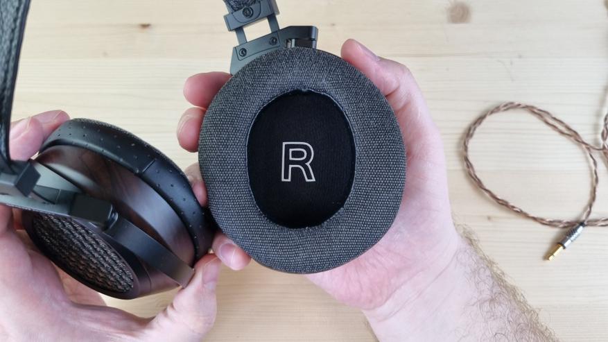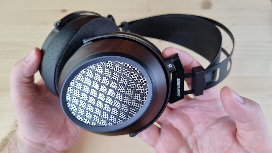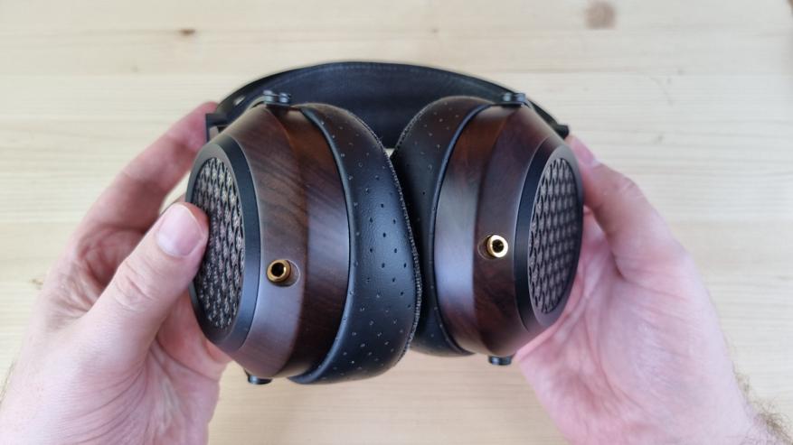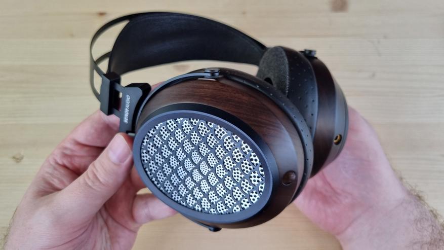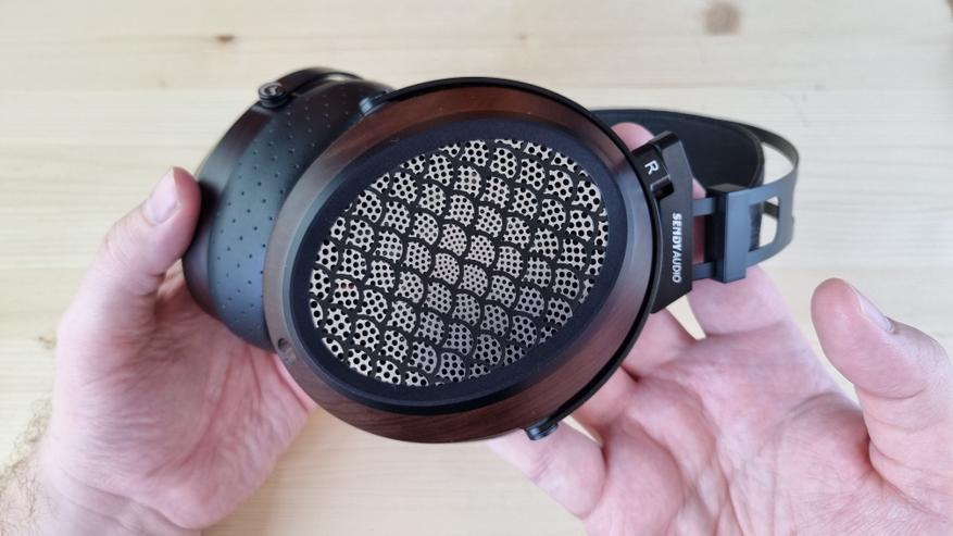 Чашечки, как я уже упомянул, имеют деревянную основу с большой металлической решеткой по центру. Именно она и обеспечивает заявленную нам открытую конструкцию. И это, кстати, первые полноразмерные наушники, где я вообще не слышал хоть сколь либо ощутимых отражений.