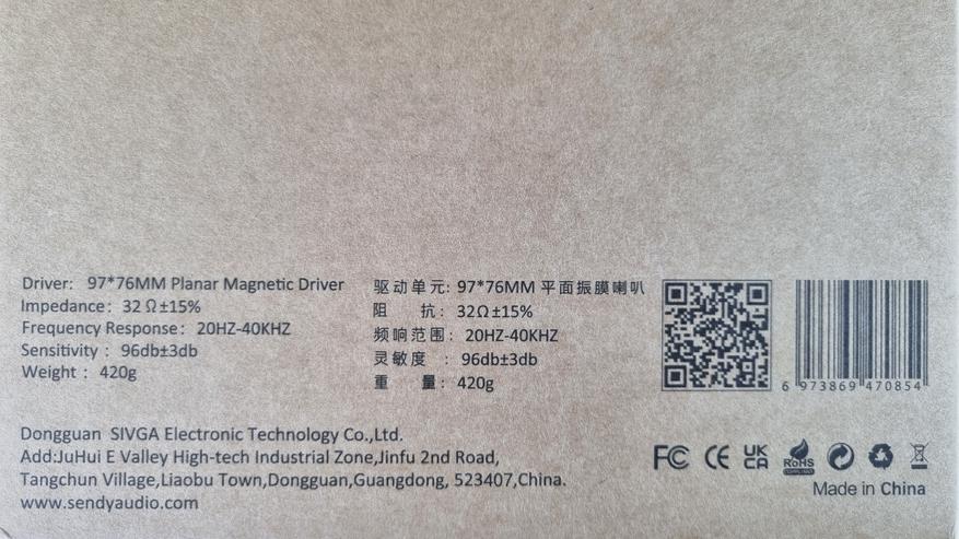 Пришли наушники в большой коробке из переработанного картона с перечнем их технических характеристик.