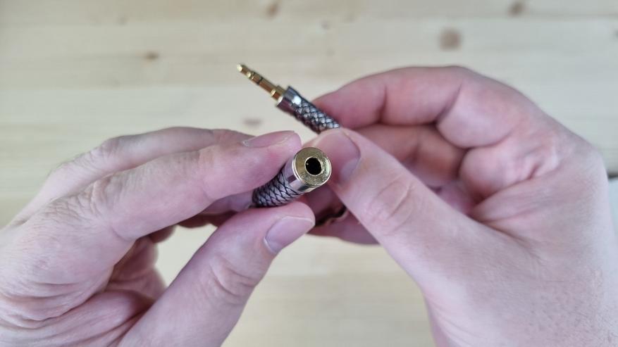 Кабель — дорогой, с деревянным разветвителем и двумя коннекторами по 3.5 мм. То есть, в случае чего, найти ему замену можно в два счета.