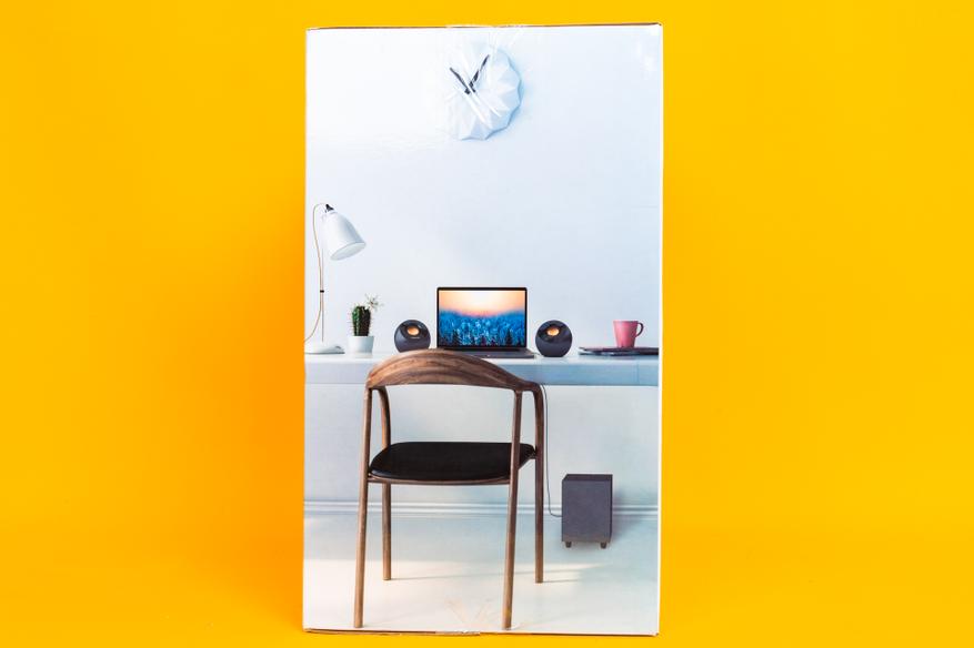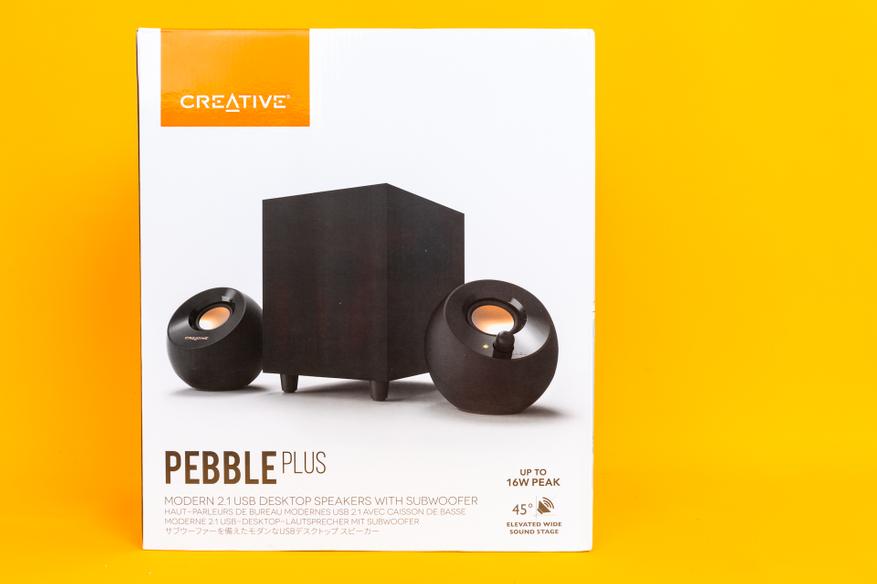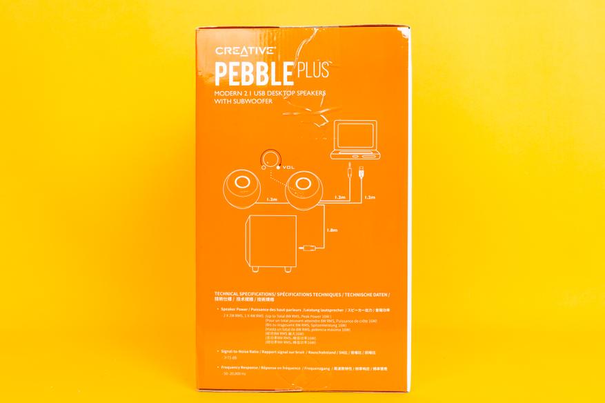 Упаковка Creative Pebble Plus выполнена в форме куба. К сожалению, ручек для удобной транспортировки данной акустической системы на коробке не предусмотрено, но за счёт небольшого веса нести её не тяжело. Оформление упаковки выполнено в фирменном стиле компании Creative. Глядя на упаковку можно узнать о том, как в живую выглядит акустическая система Pebble Plus, её комплектация, а так же о ключевых особенностях и технических характеристиках.