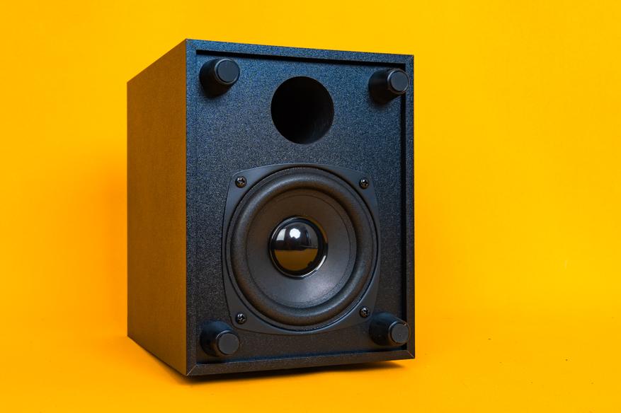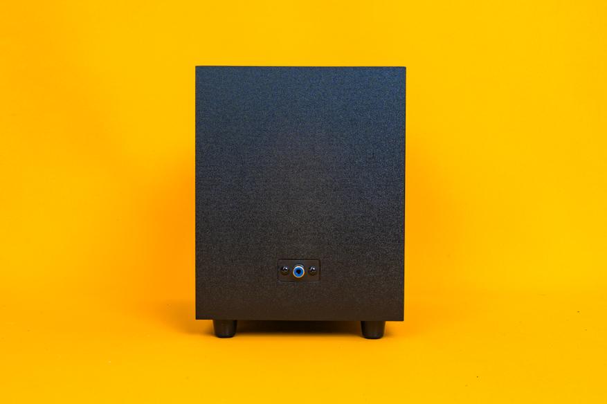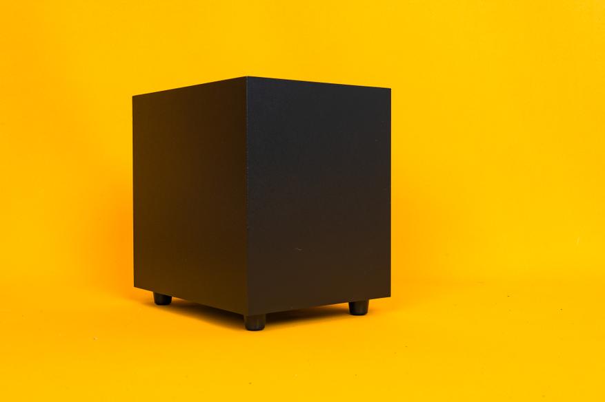 Ножки у сабвуфера пластиковые, с резиновыми накладками для устойчивости.