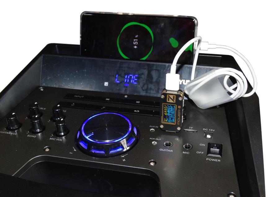 Учитывая размеры аудиосистемы, слово портативный может показаться не совсем корректным, но, как уже выяснилось ранее, переносить акустику вполне возможно. Может она и частично заменить Power Bank — при подключении электронной нагрузки защита от перенапряжения срабатывает при токе 2.4 ампера.