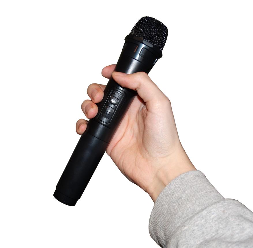 Микрофон по своему внешнему виду максимально похож на аналоги, которыми комплектуются аудиосистемы некоторых других брендов. Элементами питания микрофона являются две батарейки типоразмера AAA — без них устройство весит 136, а с ними — примерно 160 граммов. Материал корпуса микрофона - пластик, а вот верхняя часть защищена металлической сеткой.