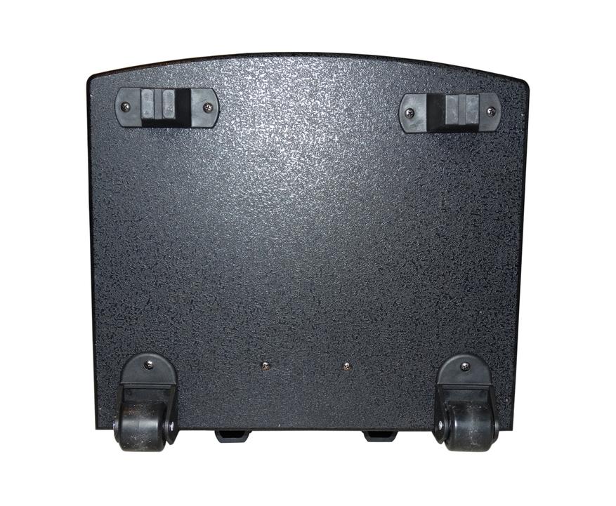 На нижней стороне акустики находятся два колёсика, за счёт которых и осуществляется удобная переноска аудиосистемы. Также, помимо колёсиков, есть две пластиковые ножки, которые в теории могут оставлять следы на полу, так как они не оснащены резиновыми вставками, но при этом края ножек закруглены, а материал, по ощущениям, максимально гладкий. Поэтому есть сомнения в том, что ножки способны повредить какое-нибудь покрытие на полу (в этом плане есть гораздо менее продуманные аналоги), хотя осторожность не помешает.