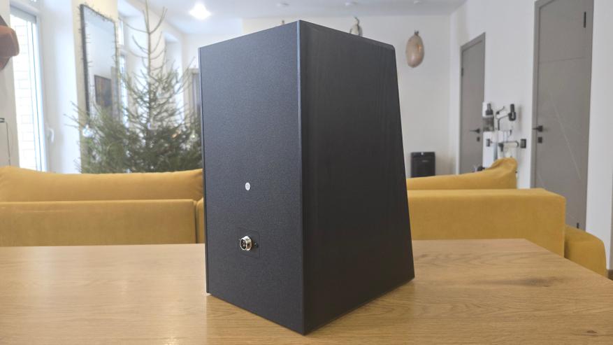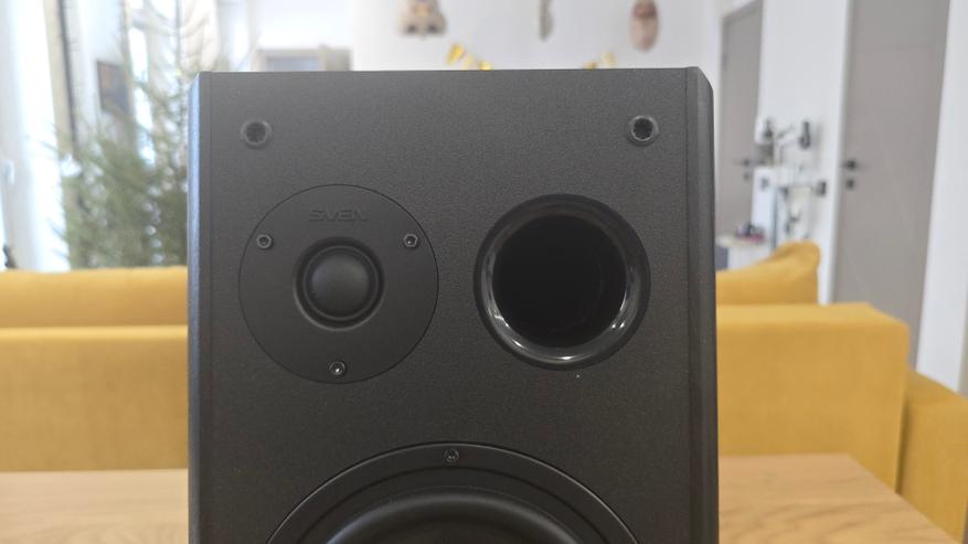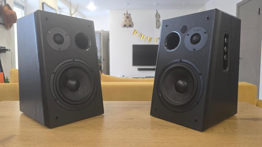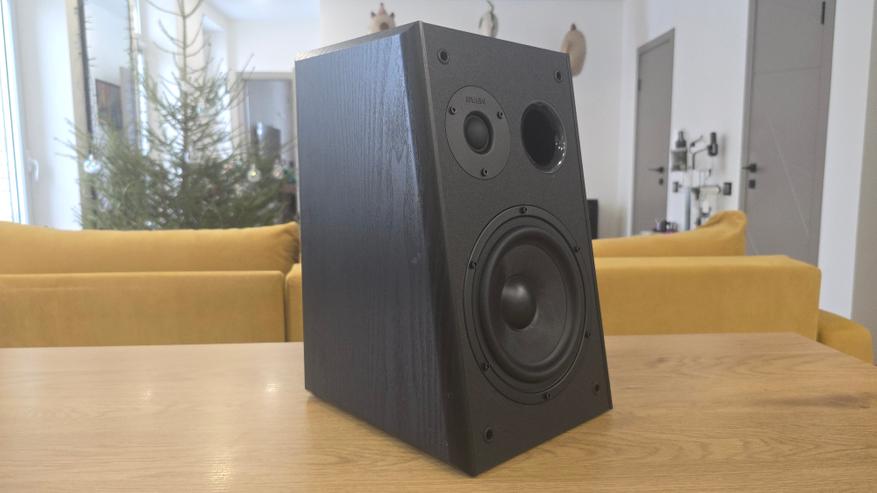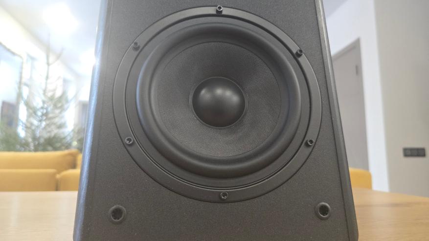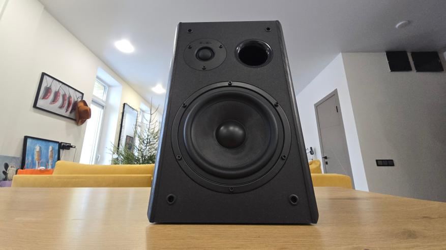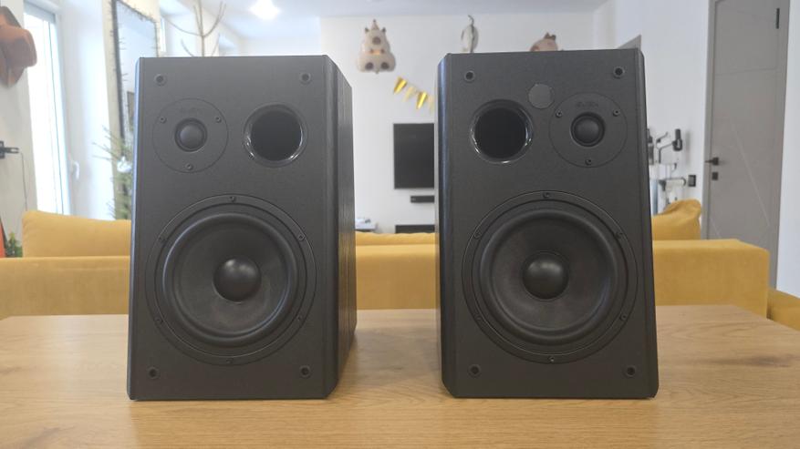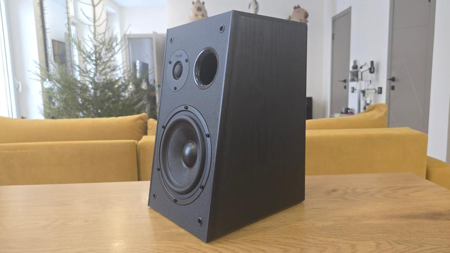 Передняя панель у обеих колонок наклонена назад. Это хорошо заметно при взгляде сбоку и сразу выдает ориентацию на настольное размещение. В верхней части расположен купольный твитер диаметром 26 мм с шелковой мембраной, ниже — основной динамик 6.5 дюйма с диффузором из стекловолокна. Между ними, ближе к твитеру, находится круглое отверстие фазоинвертора. Такое расположение хорошо читается визуально и одинаково реализовано на обеих колонках. Крепеж динамиков открыт, без декоративных колец, что делает внешний вид сдержанным и утилитарным. Без накладок передняя панель становится более технической по восприятию, с полностью открытыми динамиками и портом фазоинвертора.