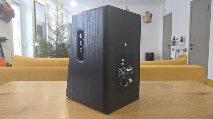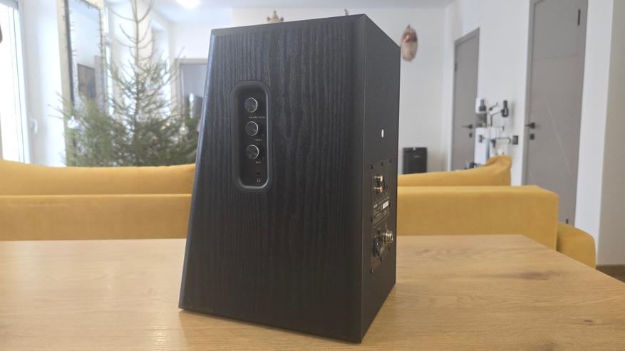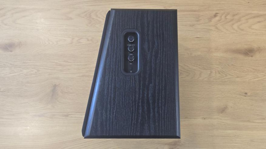 Отдельного внимания заслуживает боковая панель основной колонки. Именно здесь находятся органы управления. Панель утоплена в корпус и оформлена как вертикальный блок с мягкими скруглениями. В верхней части расположен регулятор громкости, совмещенный с выбором источника, ниже — отдельные регуляторы высоких и низких частот с маркировкой «+» и «-». Под ними находится разъем для подключения наушников 3.5 мм. Все регуляторы выполнены в виде вращающихся энкодеров без ограничителей, визуально выглядят одинаково и не перегружают дизайн.