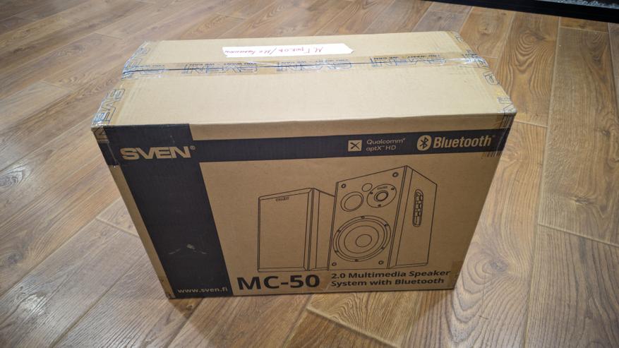 Акустика поставляется в коробке из плотного неокрашенного картона. Оформление сдержанное и утилитарное: на лицевой стороне крупно указано наименование модели MC-50, логотип SVEN и схематичное изображение самих колонок. Отдельными пиктограммами и подписями вынесены ключевые особенности.