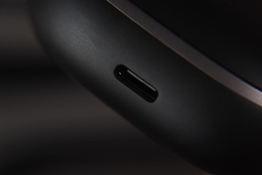 На торце кейса находится индикаторная полоска, USB-C порт расположен снизу, кнопка сопряжения — на задней панели.
