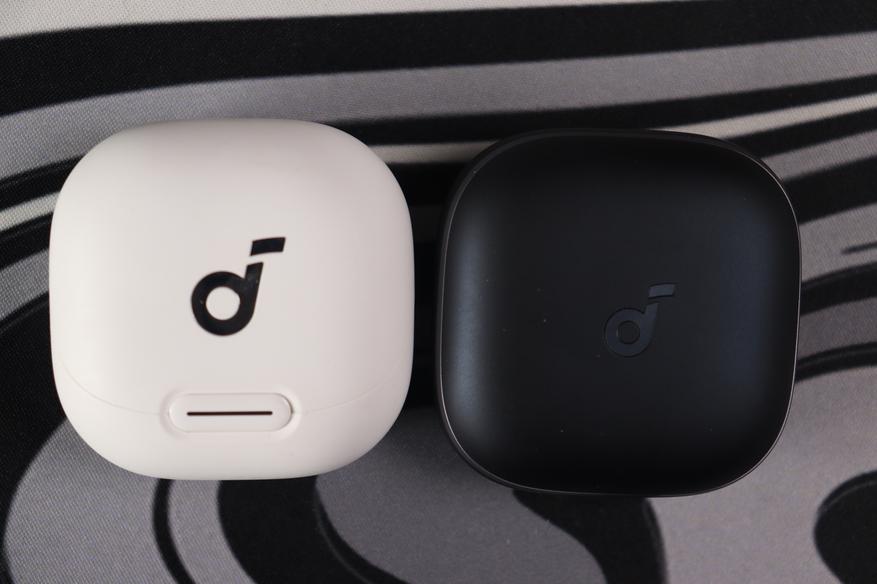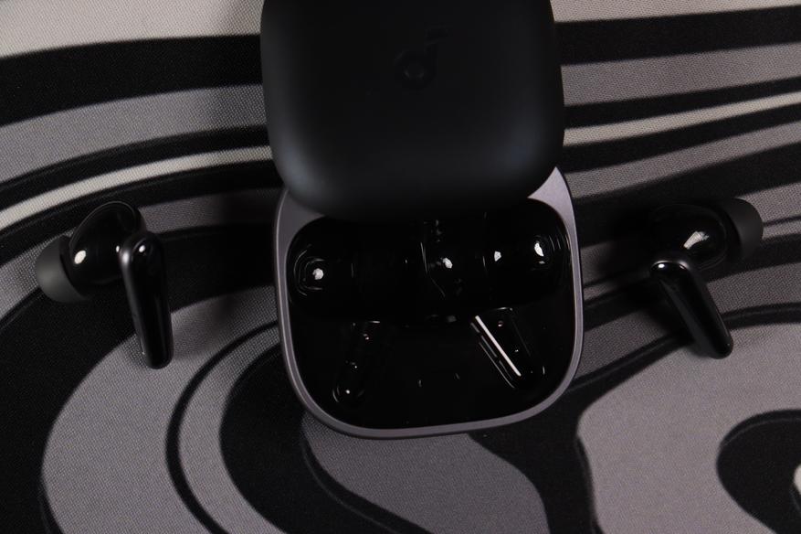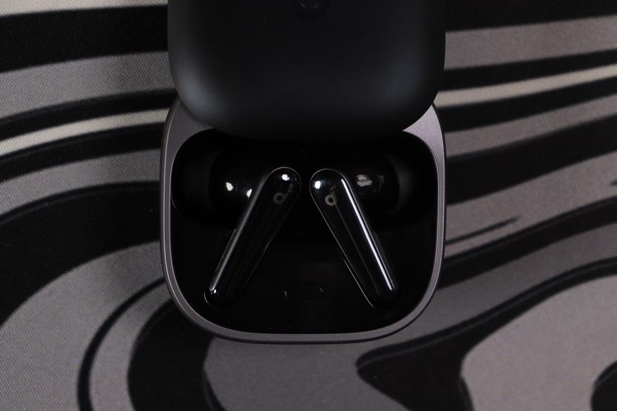 Liberty 5 выпускаются в многих цветах. Черная версия использует комбинацию глянцевой поверхности на ножках наушников и матовой текстуры на кейсе, что практично с точки зрения маркости. Кейс компактный, с округлыми формами, подсветкой на передней панели, легко помещается в карман. На крышке — ненавязчивый тисненый логотип Soundcore.