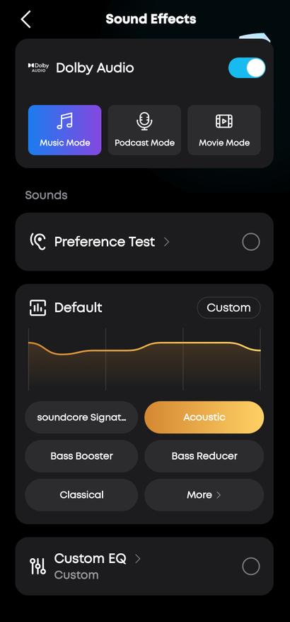 Раздел Sound Effects предлагает активацию Dolby Audio с тремя режимами: Music Mode, Podcast Mode и Movie Mode. Ниже расположена кнопка Preference Test — это HearID калибровка звука под индивидуальные особенности слуха. Система предлагает набор предустановленных пресетов (Soundcore Signature, Acoustic, Bass Booster, Bass Reducer, Classical и другие), а также десятибандный эквалайзер для ручной настройки.