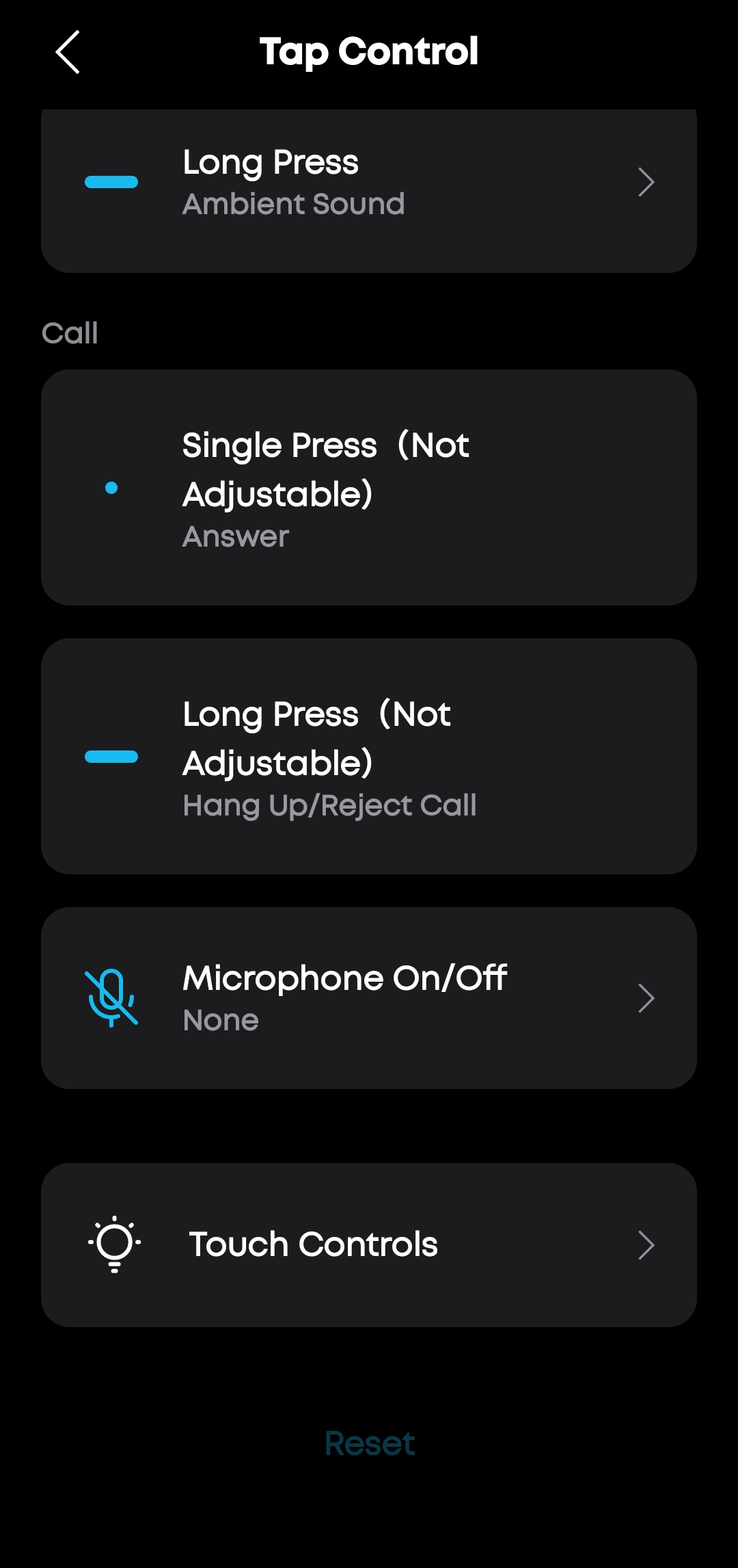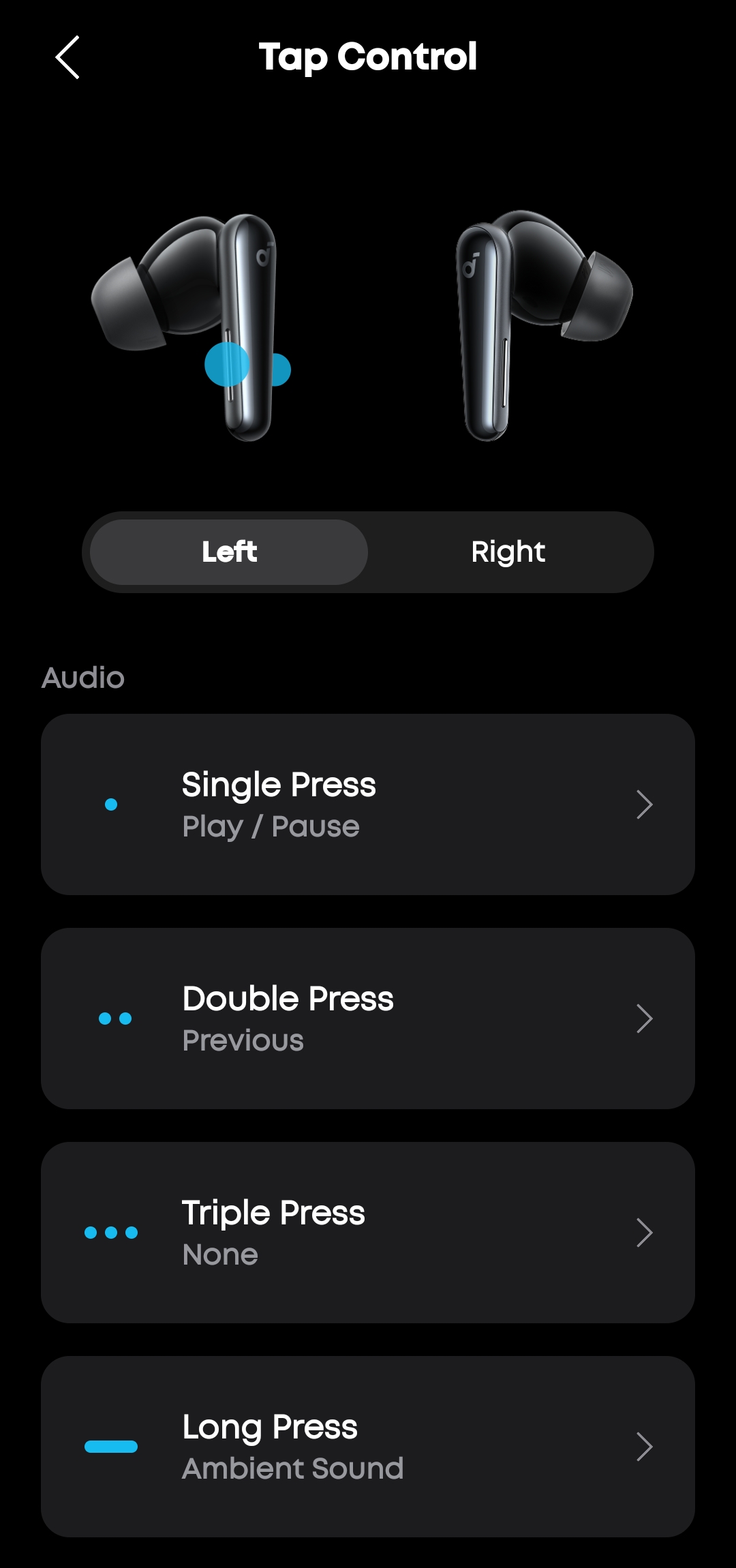 В настройках управления (Controls) настраивается поведение сенсорных панелей: одинарное, двойное, тройное нажатие и долгое удержание для каждого наушника отдельно. По умолчанию одинарное нажатие отвечает за воспроизведение/паузу, двойное — предыдущий трек, длинное удержание — переключение режимов Ambient Sound. Жесты для звонков не изменяются.