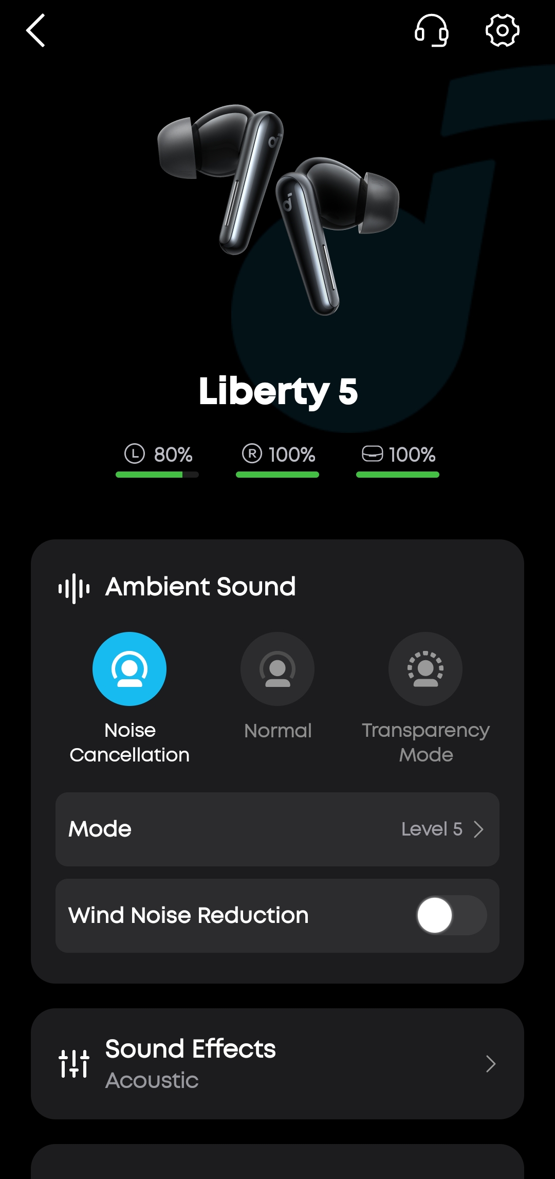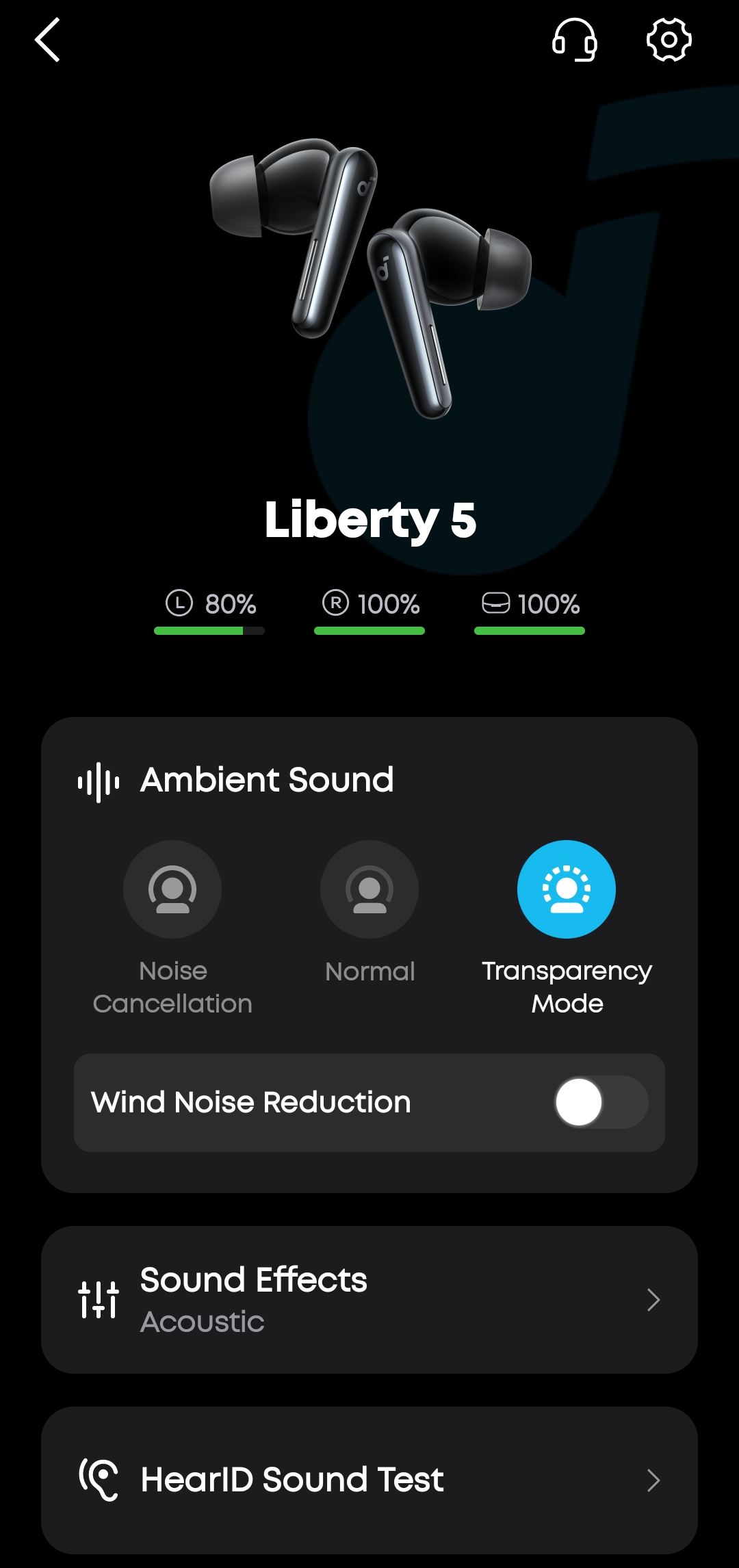 В разделе Ambient Sound переключаешься между тремя режимами: шумоподавление (Noise Cancellation), обычный (Normal) и режим прозрачности (Transparency Mode). Для ANC доступна ручная регулировка интенсивности от 1 до 5 уровня, либо автоматический транспортный режим с двумя пресетами — для самолета и автомобиля. Также есть переключатель Wind Noise Reduction для подавления шума ветра.