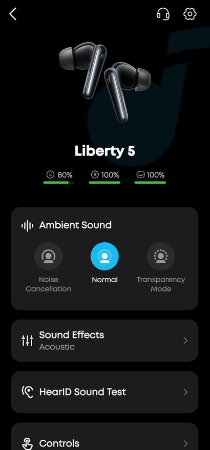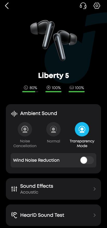 Наушники управляются через фирменное приложение Soundcore, доступное для iOS и Android. Интерфейс интуитивно понятный, выполнен в темной теме с голубыми акцентами. На главном экране отображается 3D-модель наушников с индикацией заряда каждого вкладыша и кейса.
