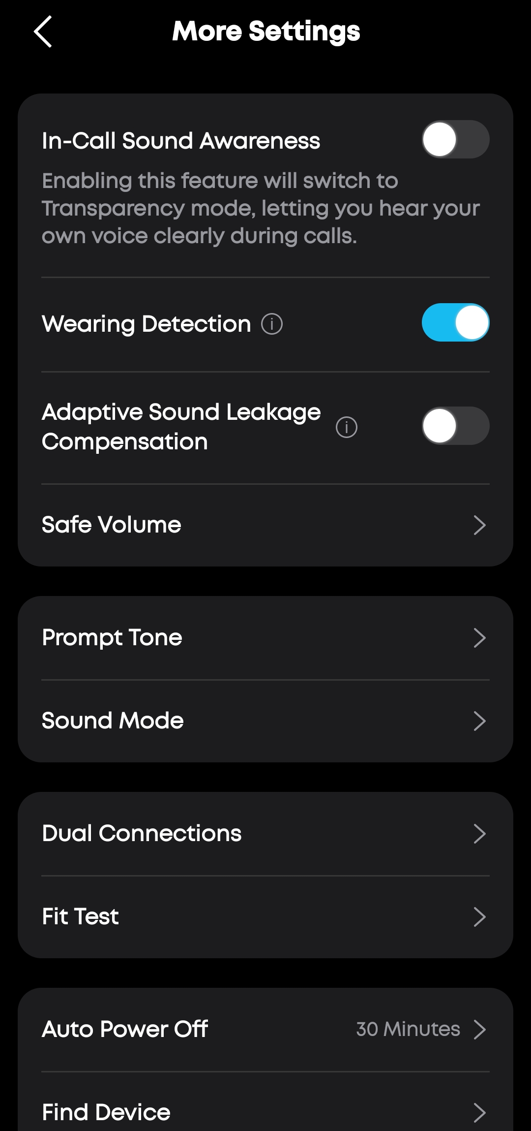 Дополнительные настройки включают Wearing Detection (автопауза при снятии наушников), чувствительность сенсорных панелей (Firmest, Medium, Softest), Dual Connections для одновременного подключения двух устройств, Fit Test для проверки правильности посадки, Auto Power Off — автовыключение и функцию Find Device, когда наушники издают громкий звук для их поиска в случаи потери.