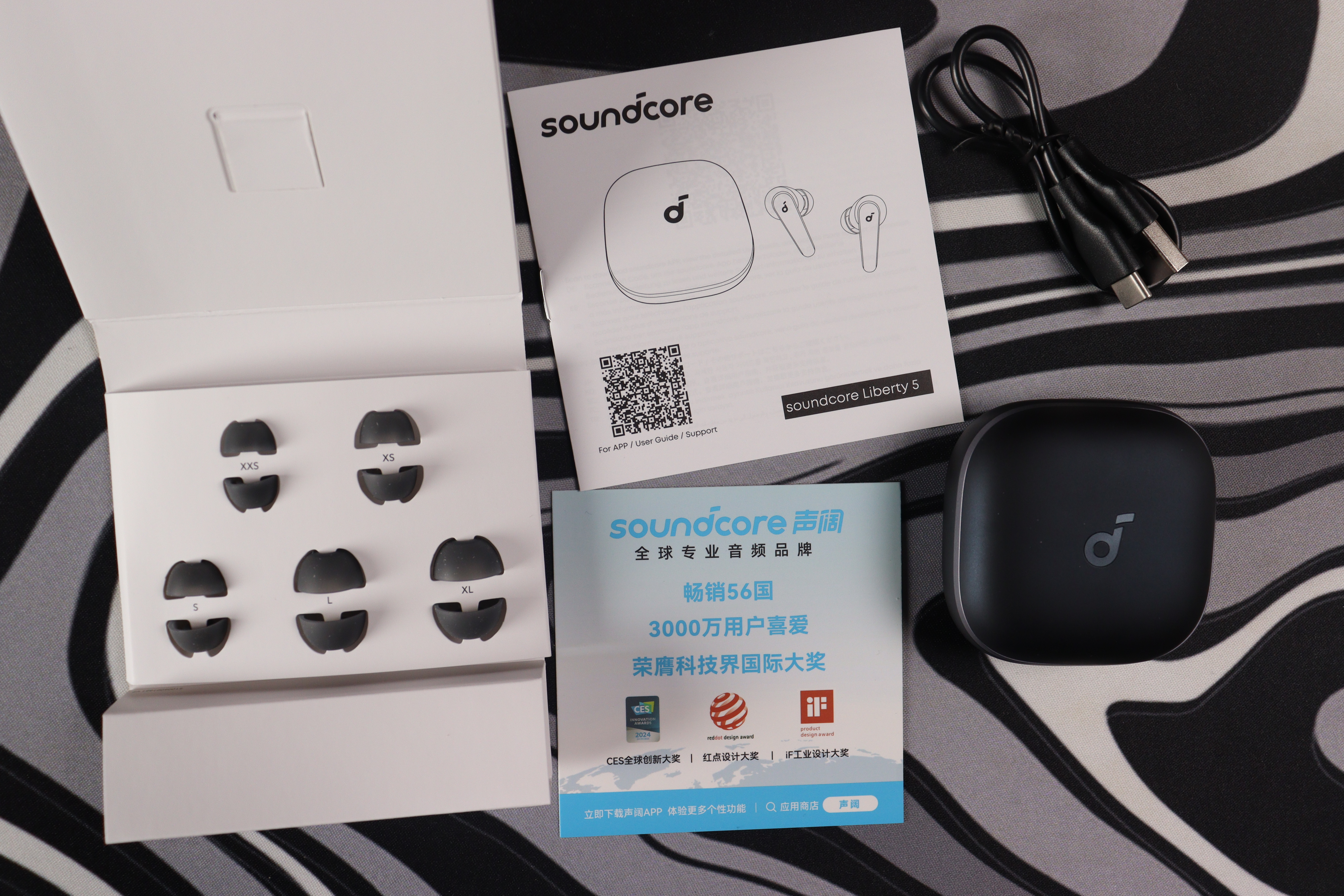 В коробке находятся сами наушники с зарядным кейсом, шесть пар силиконовых амбушюр разных размеров (от XXS до XL), короткий USB-C кабель для зарядки и стандартная документация. Набор амбушюр действительно впечатляет — правильный подбор размера критичен как для комфорта, так и для качества звука, особенно басовой составляющей. Упаковка выполнена качественно, все элементы аккуратно уложены в картонные ложементы.