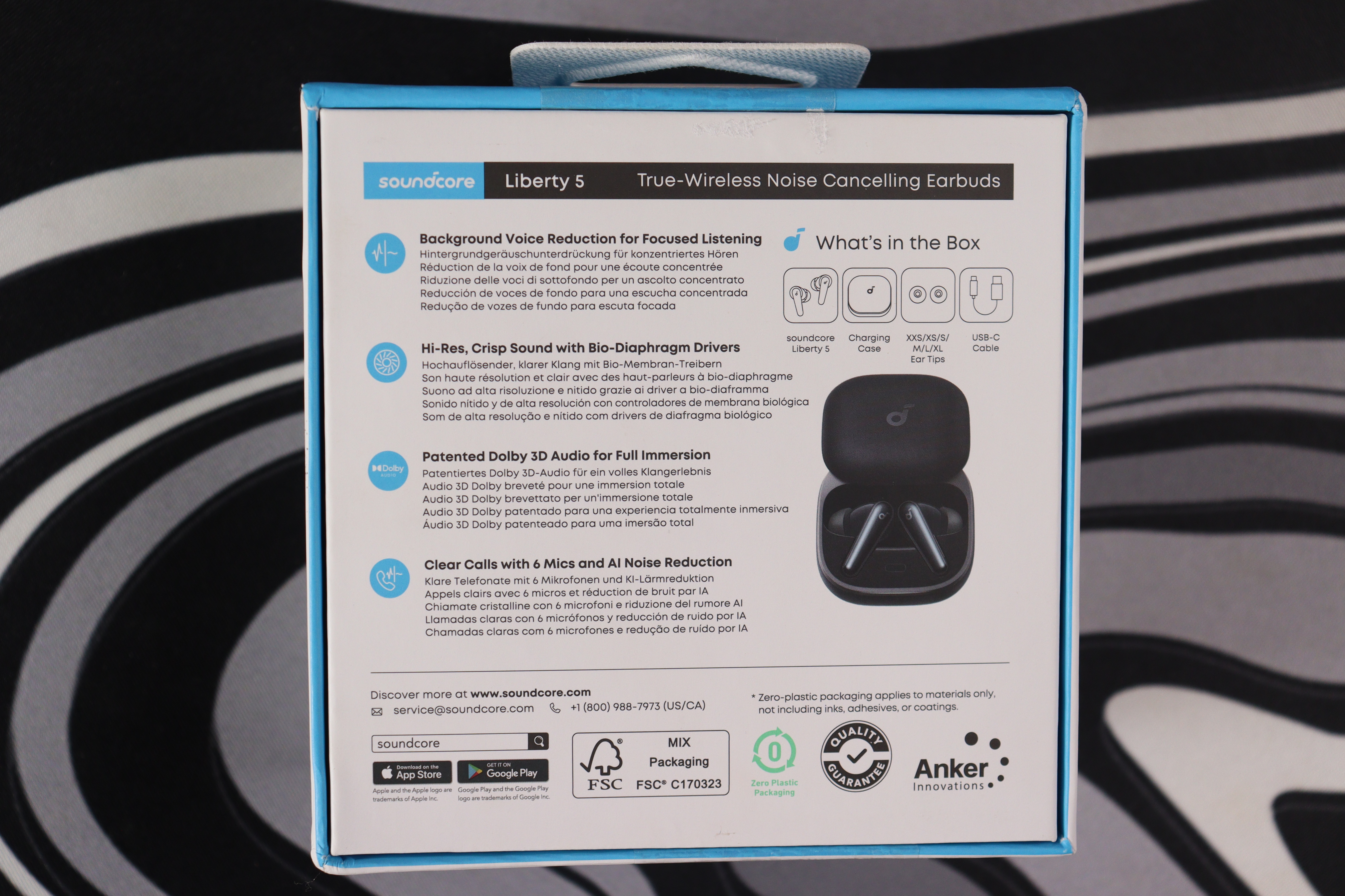 На задней стороне коробки перечислены основные характеристики: фоновое шумоподавление для звонков с шестью микрофонами, био-мембранные драйверы, Dolby Audio, Hi-Res сертификация. Общее впечатление от распаковки положительное — никакого ощущения бюджетного продукта.
