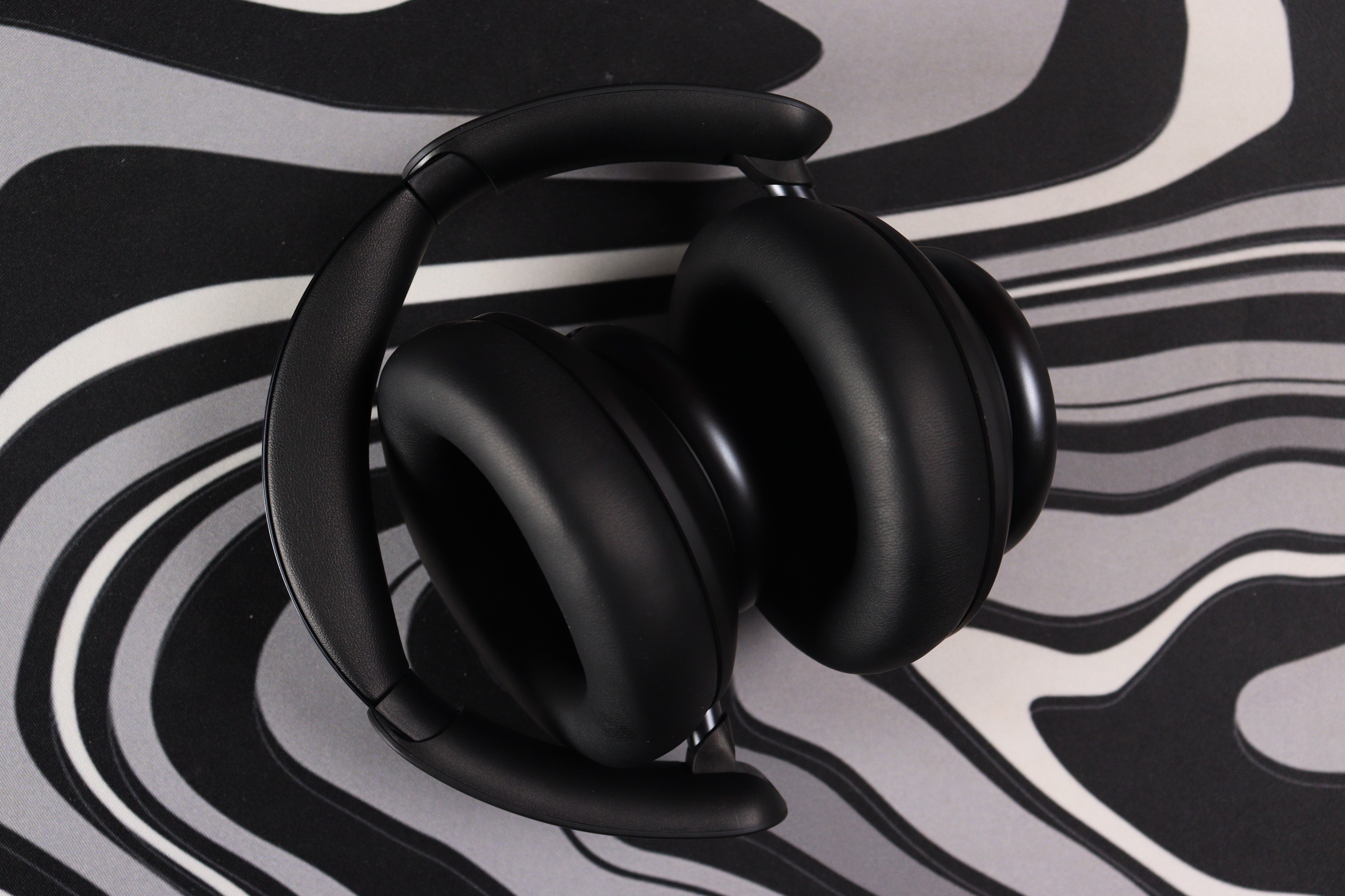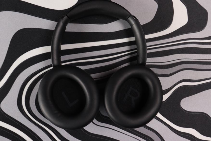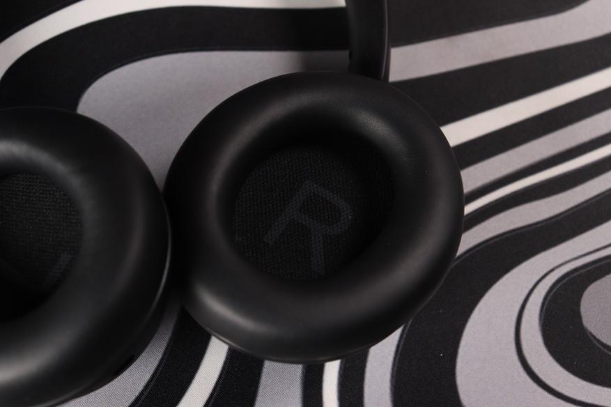 Чашки крупные, но не громоздкие. Овальная форма повторяет анатомию уха, создавая хорошую изоляцию. Амбушюры выполнены из мягкого протеинового кожзама с эффектом памяти — они буквально обволакивают уши, не давя и не перегревая даже после нескольких часов использования. Внутри виден чёрный текстиль с микроперфорацией, под которым скрываются драйверы.