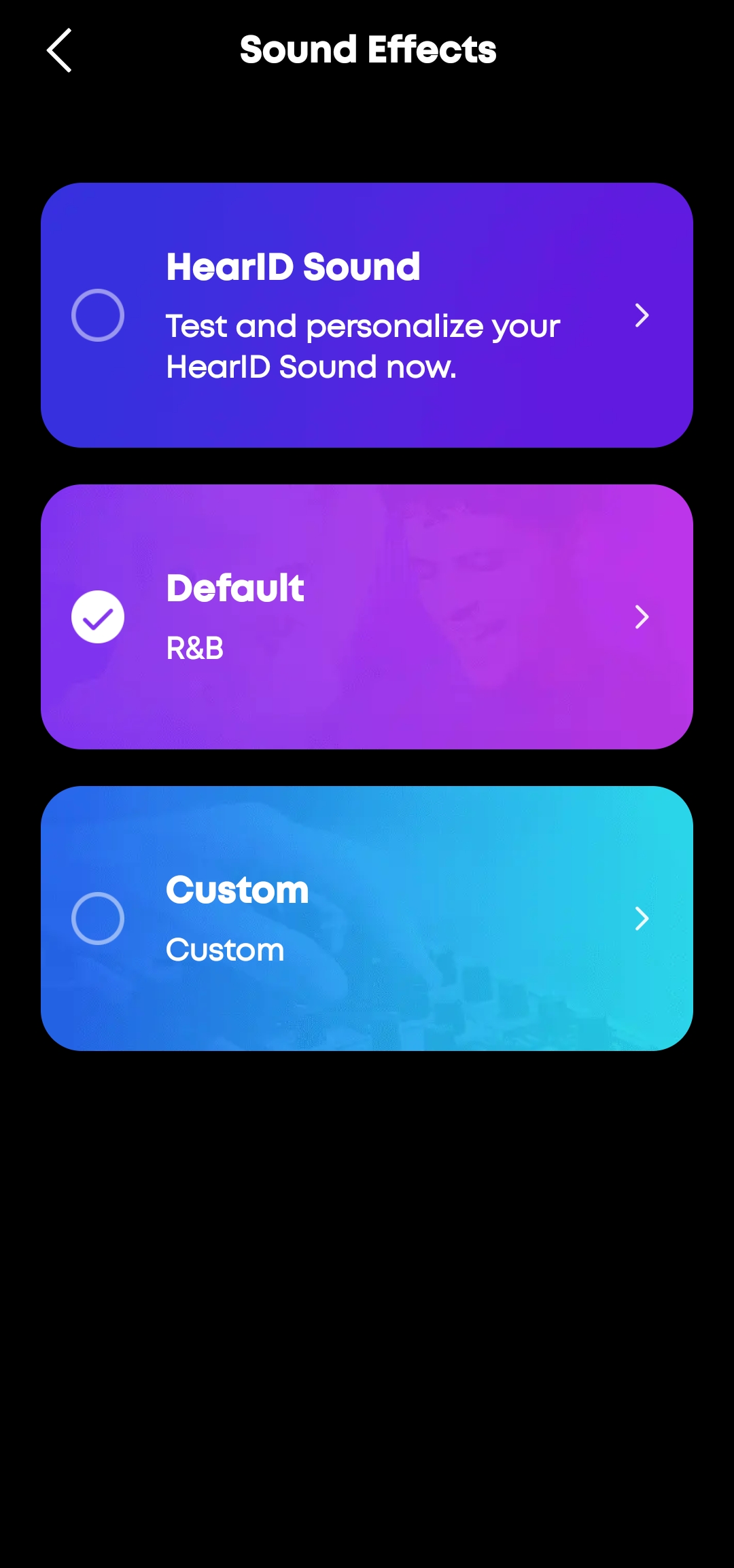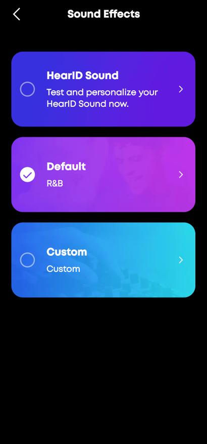 Sound Effects — главный раздел звуковых настроек. Тут живёт HearID Sound — функция персонализации звучания через тест слуха. Приложение проигрывает серию тонов на разных частотах, ты отмечаешь, что слышишь, и система создаёт индивидуальный профиль. Результат ощутимый: звук становится сбалансированнее, детали проявляются чётче. Также доступны готовые пресеты и полностью кастомный эквалайзер с восемью полосами. Можно сохранять свои профили и переключаться между ними на лету.