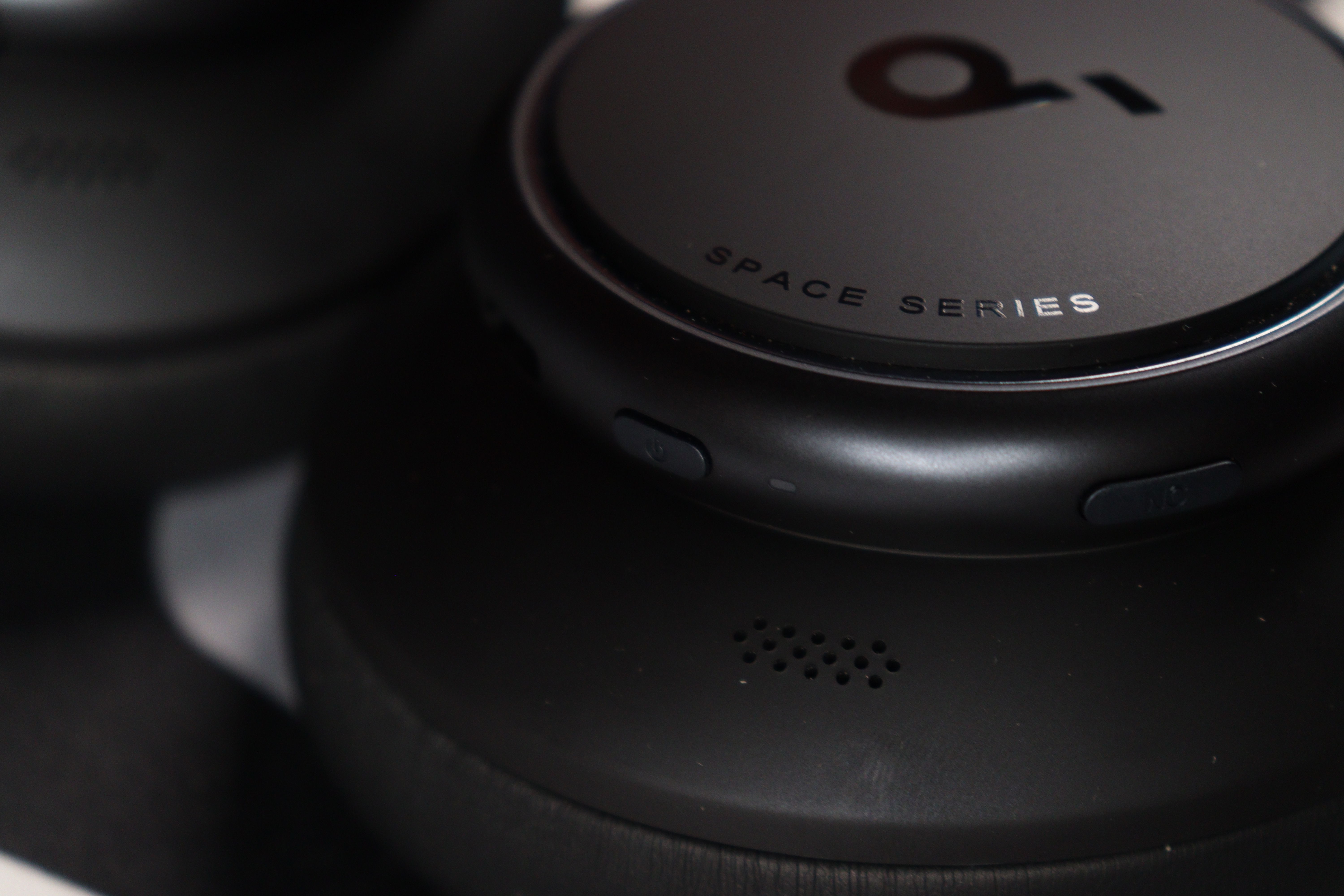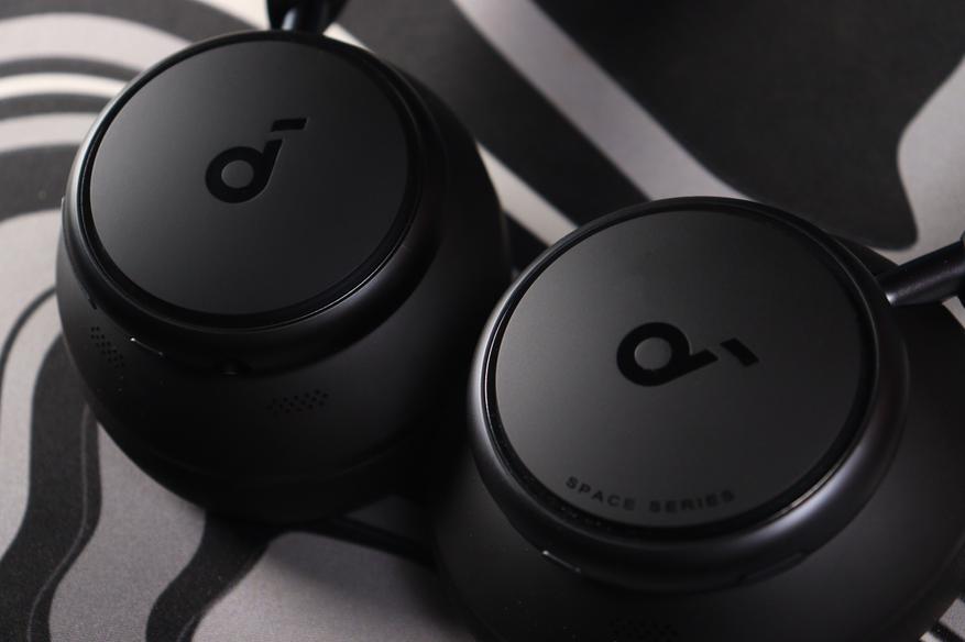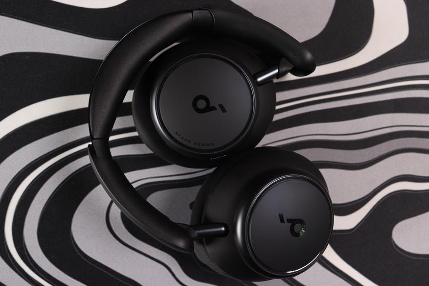 Первое впечатление от Space Q45 — это не бюджетные наушники. Матовый чёрный пластик чашек выглядит благородно, без дешёвого глянца и отпечатков пальцев. На внешней стороне каждой чашки красуется минималистичный логотип в виде ноты — узнаваемо и ненавязчиво. Под ним надпись «SPACE SERIES».