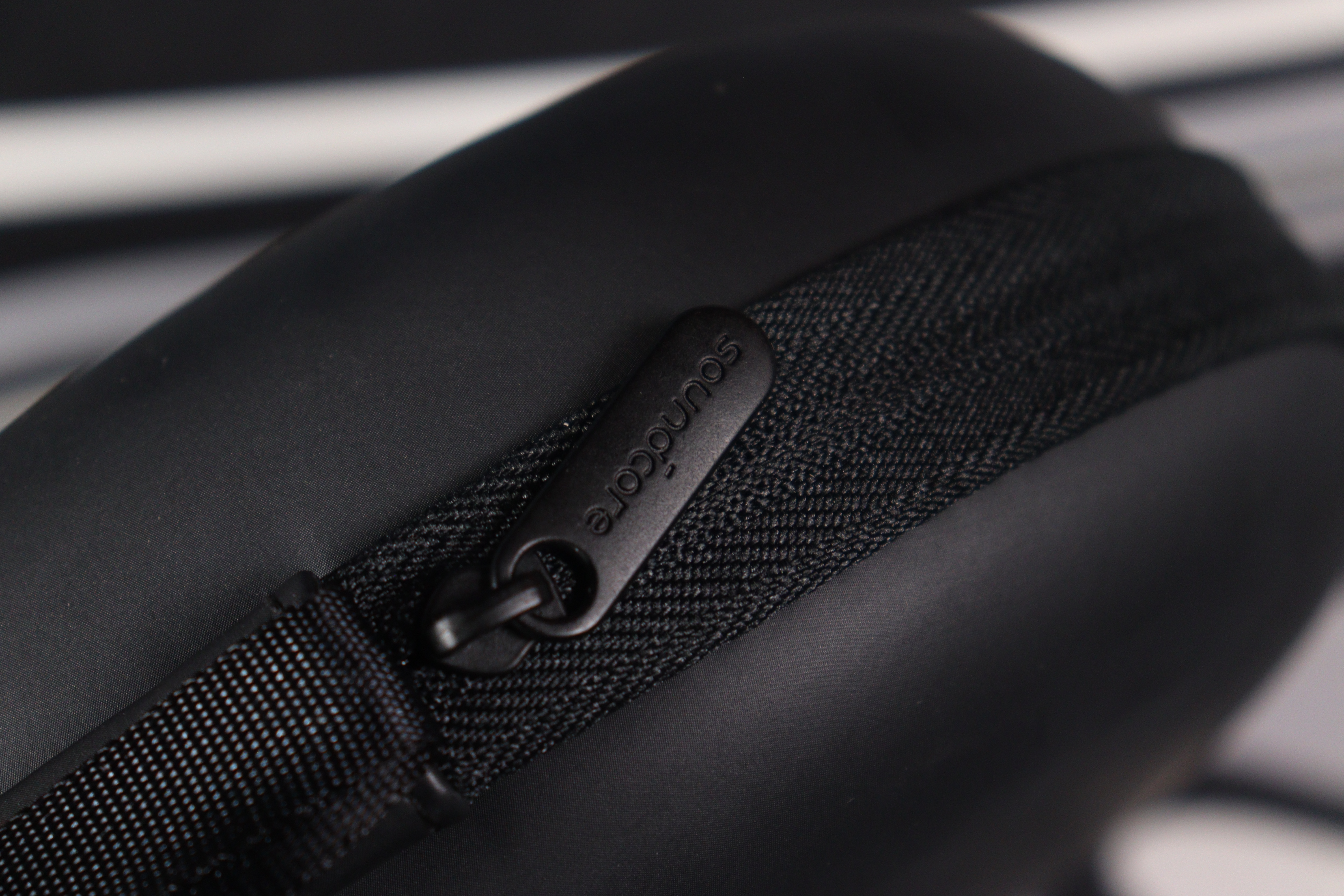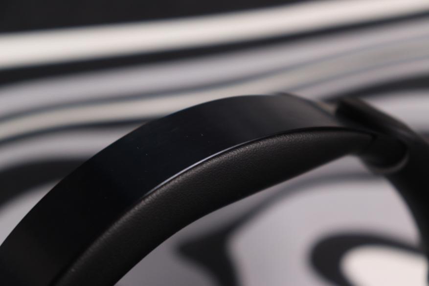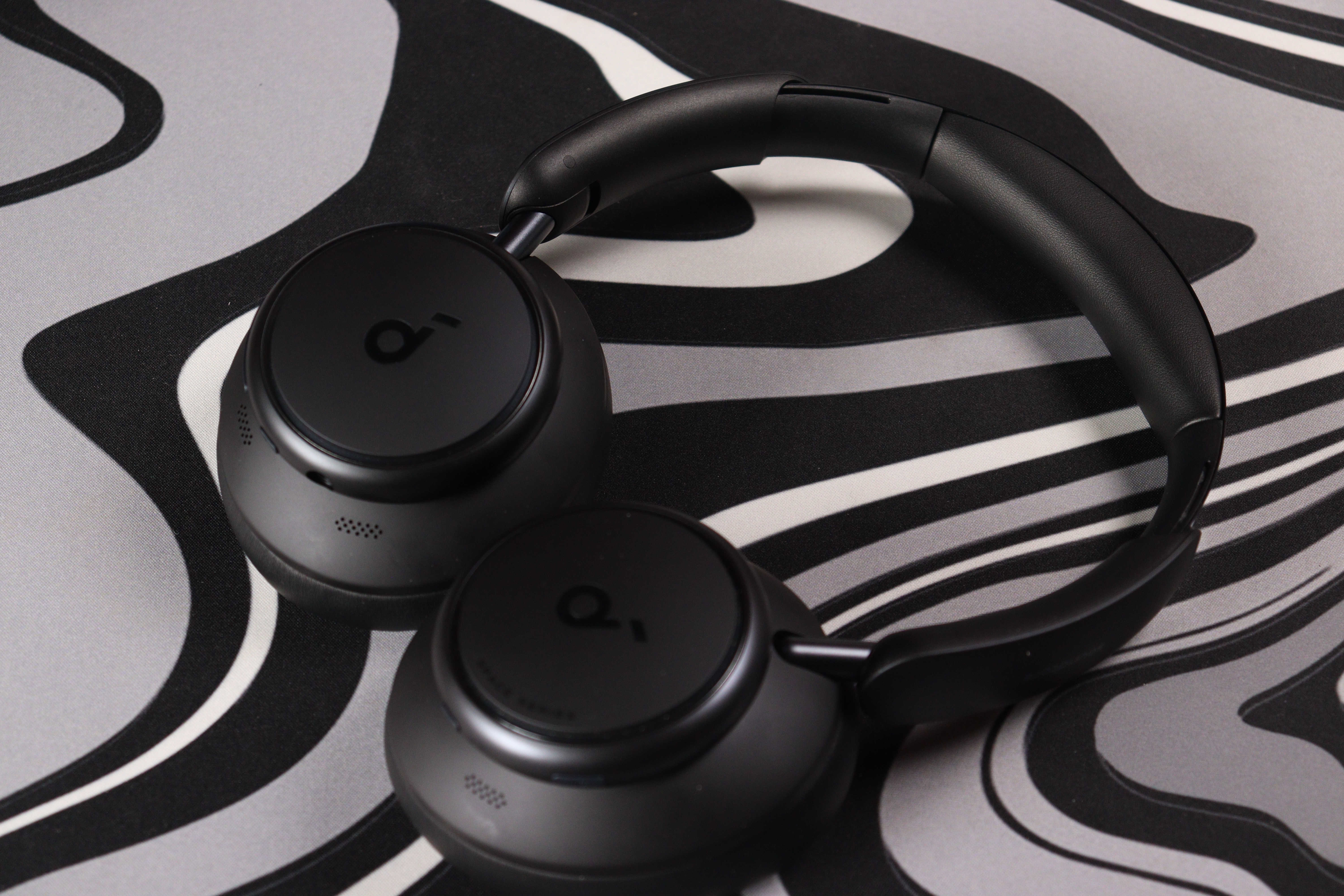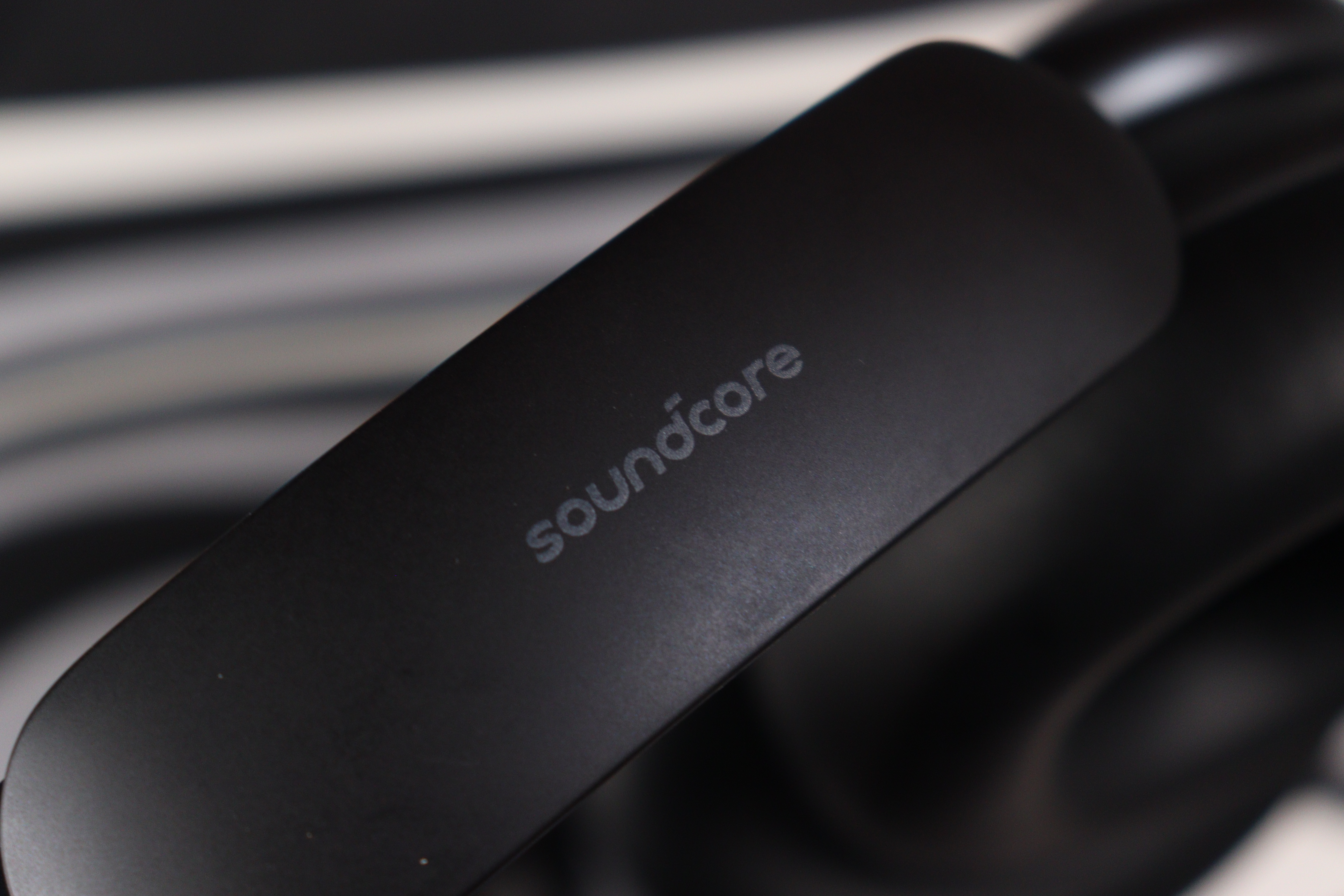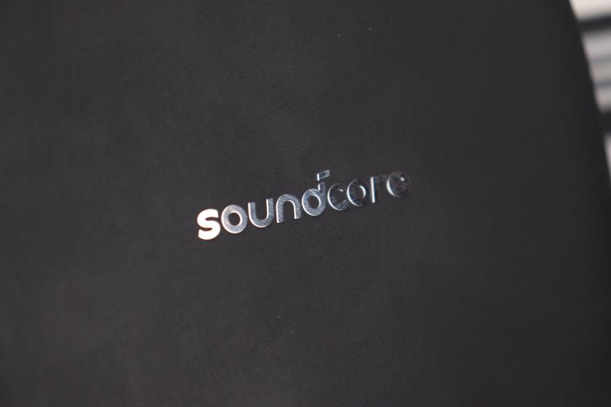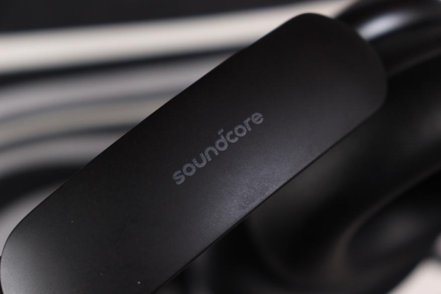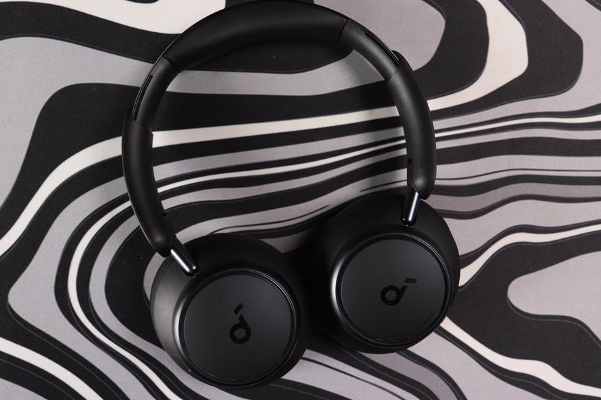 Оголовье широкое, с мягкой подкладкой из того же материала, что и амбушюры. Сверху — рельефный логотип Soundcore, выполненный в тон корпусу. Металлические направляющие дуги выдвигаются плавно, с отчётливыми щелчками фиксации на каждом делении. Никаких люфтов, скрипов или ощущения хлипкости — сборка действительно качественная.