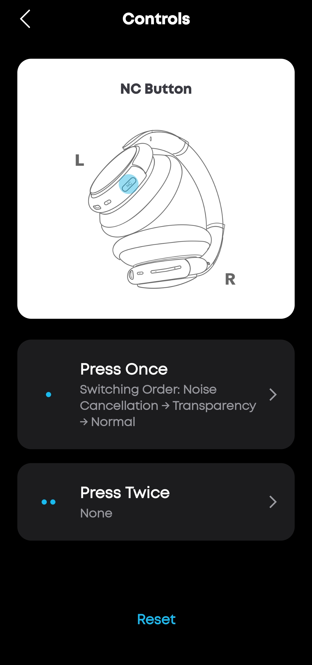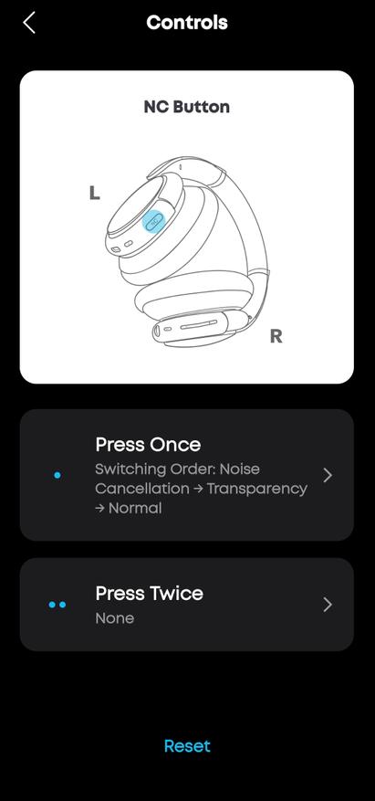 Controls — настройки кнопки NC на левой чашке. По умолчанию одно нажатие переключает режимы ANC → Transparency → Normal. Двойное нажатие можно назначить на другие действия. Схема с иллюстрацией наушников помогает не запутаться.