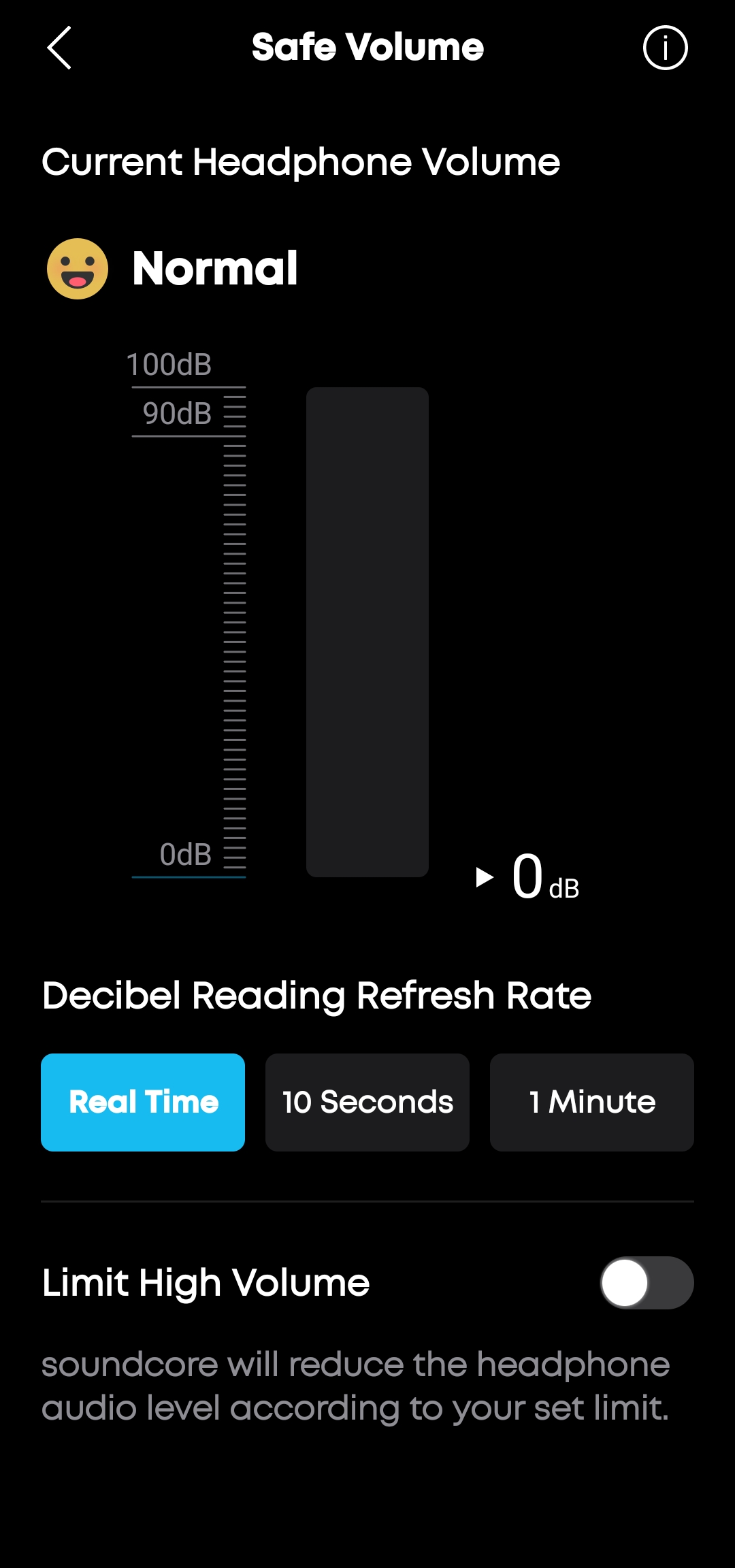 Safe Volume — забота о здоровье. Показывает текущий уровень громкости в децибелах с визуальной шкалой от 0 до 100 дБ. Можно включить ограничение максимальной громкости, чтобы случайно не повредить слух. Обновление показаний идёт в реальном времени.