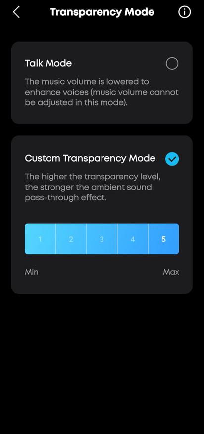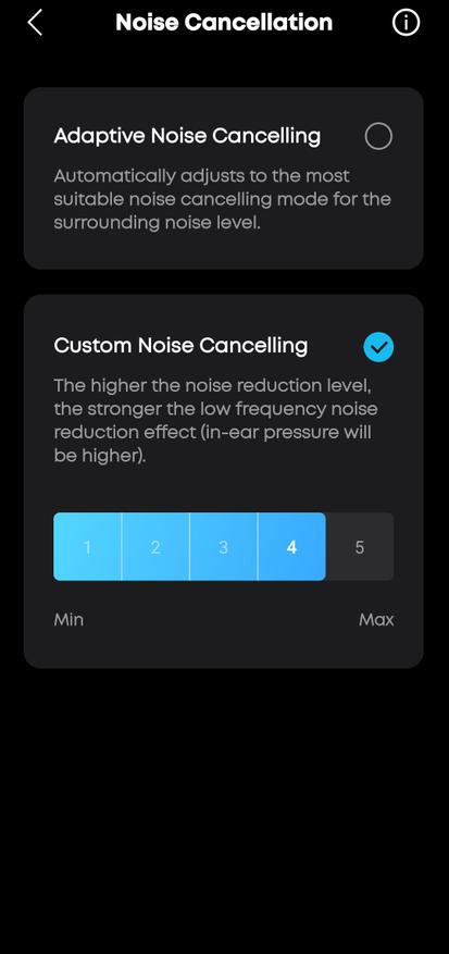 Ambient Sound — блок управления шумоподавлением. Здесь три режима: Noise Cancellation (активное подавление шума), Normal (без обработки) и Transparency Mode (режим прозрачности). Переключение моментальное, одним тапом. В настройках ANC доступно два варианта: Adaptive (автоматическая подстройка под уровень окружающего шума) и Custom (ручная регулировка интенсивности по пятибалльной шкале). Чем выше уровень, тем сильнее давление на барабанные перепонки — это нормально для мощного шумодава. Режим прозрачности тоже настраиваемый: можно выбрать режим Talk Mode (приглушает музыку для разговора) или с регулировкой от минимума до максимума пропускаемых звуков.