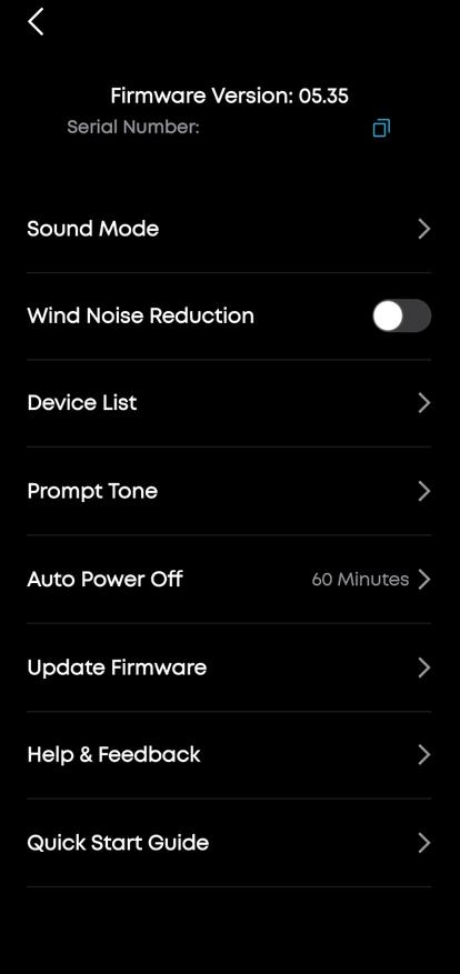В настройках (шестерёнка в правом верхнем углу) спрятаны дополнительные опции. Sound Mode позволяет выбрать приоритет: Preferred audio quality (LDAC для максимального качества, но с повышенным энергопотреблением и возможной нестабильностью связи) или Combine audio and connection quality (баланс между качеством и надёжностью подключения). Wind Noise Reduction активирует фильтр ветра для микрофонов во время звонков. Auto Power Off — настраивает таймер автоотключения. Есть разделы обновления прошивки и подробное руководство пользователя. Версия прошивки отображается в шапке настроек — в моем случае 05.35.
