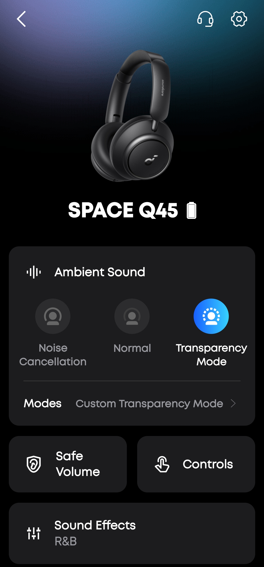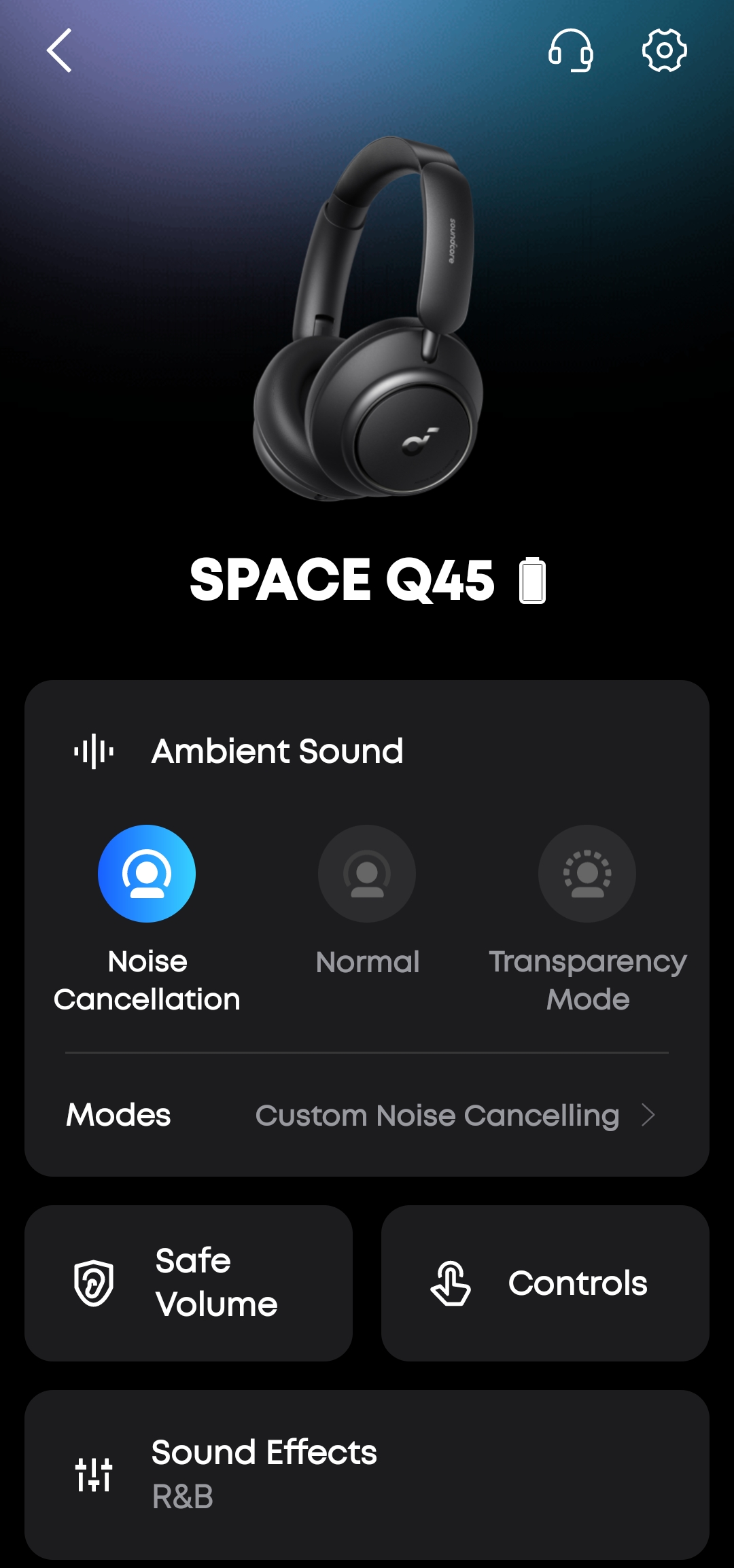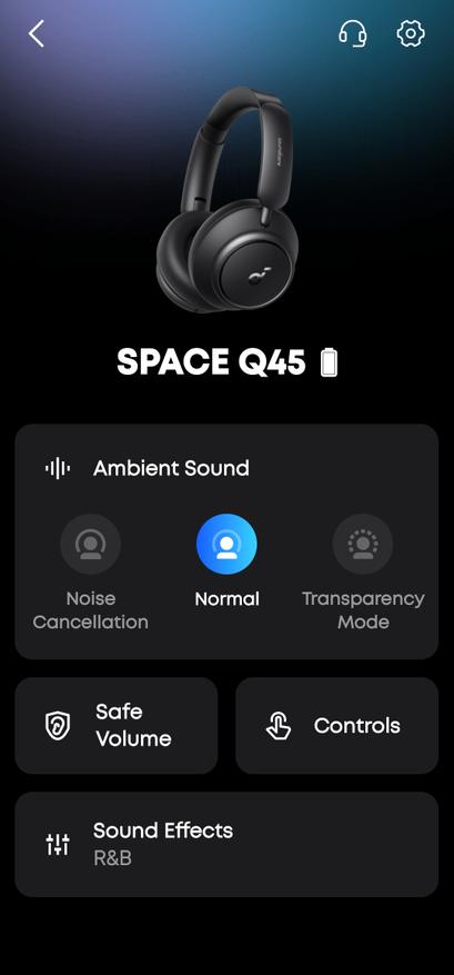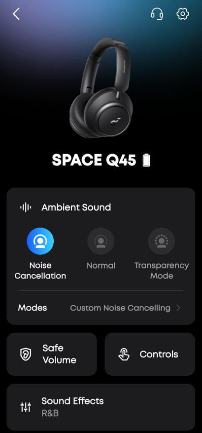 Приложение Soundcore — это не просто дополнение, а полноценный центр управления наушниками. Интерфейс современный, интуитивный, без перегруза информацией. Главный экран показывает 3D-модель Q45, уровень заряда и текущие настройки.