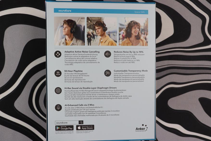 Упаковка Space Q45 выглядит строго и минималистично. Белая коробка с крупным изображением наушников и синими акцентами Soundcore сразу намекает: здесь без лишней мишуры. На лицевой стороне красуются основные фичи: адаптивное шумоподавление, 50 часов автономности, поддержка Hi-Res Audio по беспроводной связи.