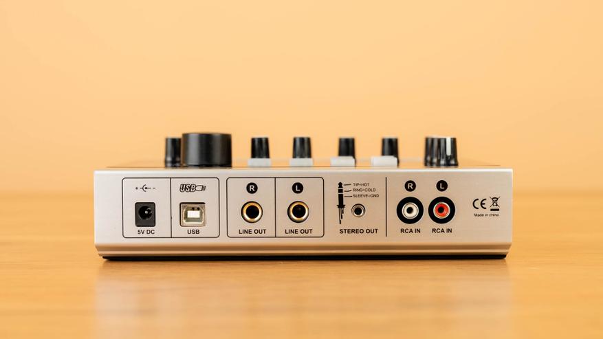 Задняя панель аудиоинтерфейса предназначена для системных подключений и включает следующие разъемы: для подачи питания используется гнездо 5V DC; цифровое соединение с компьютером обеспечивается через порт USB 2.0; а для аналоговых подключений предусмотрены вход RCA IN для внешних источников звука, а также два типа выходов — STEREO (3.5 мм) и LINE OUT (1/4″) для передачи сигнала на активные акустические системы, усилитель или другие устройства записи.