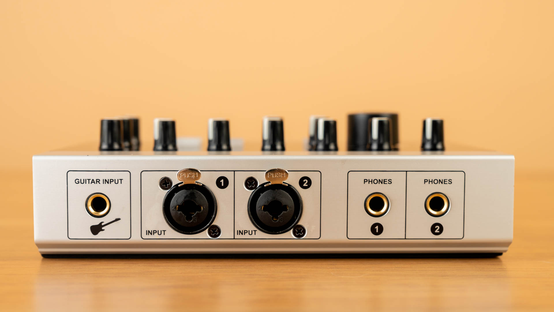 Передняя панель аудиоинтерфейса оборудована разъемами для подключения основных источников звука и мониторинга. Она включает два универсальных комбинированных входа, которые обозначены как GUITAR INPUT и INPUT. Каждый из них поддерживает подключение через стандартный 3-контактный разъем XLR (для динамических и конденсаторных микрофонов) или через разъем 1/4″ TS (для гитар и других инструментов). Для прослушивания сигнала на панели расположены два отдельных выхода PHONES со стандартными разъемами TRS для стереонаушников, что позволяет вести индивидуальный мониторинг.