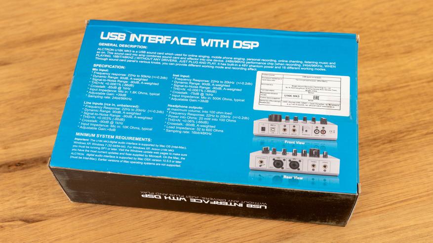 Аудиоинтерфейс U16K-MK3 поставляется в лаконичной картонной коробке. На лицевой стороне изображена сама модель, а также пиктограммы, указывающие на основные области применения устройства. На обороте представлена исчерпывающая информация о технических характеристиках модели.
