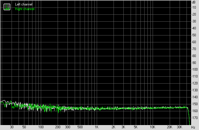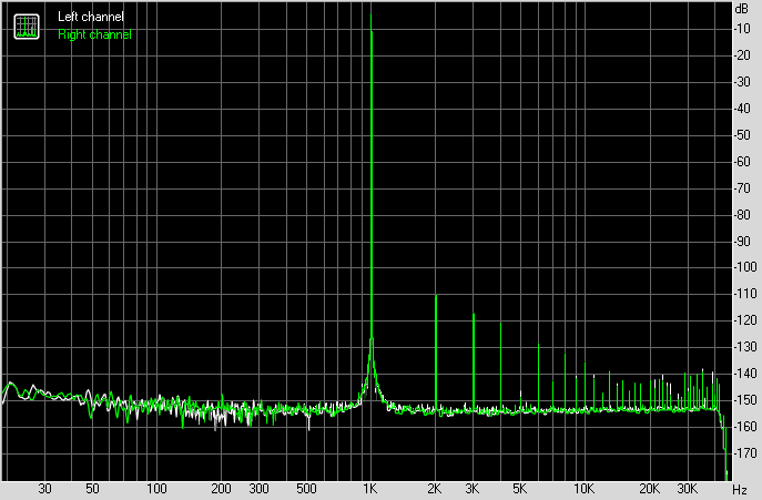 Измерения я проводил в разрешении 24 бита 96 кГц на АЦП E1DA Cosmos. В результате получил все графы в положении "отлично", за исключением взаимопроникновения каналов. Которое на небалансном выходе примерно так и выглядит. То есть все здесь на отлично. Образцово-показательный ЦАП.
