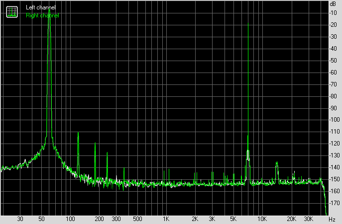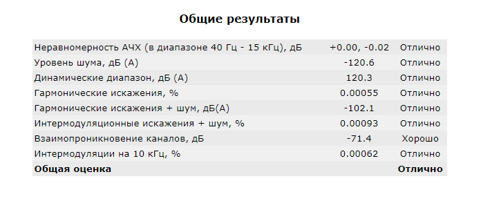 В остальном, шикарная АЧХ, шумовая полка на минус 150 дБ, прекрасный динамический диапазон и искажения на уровне минус 110 дБ, причем как интермодуляционные, так и гармонические. Последние, кстати, в цифровом эквиваленте составляют 0.00055%. Не рекорд, но все таки.