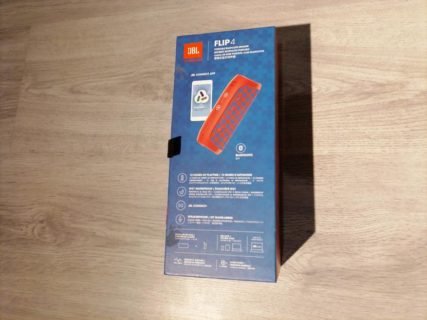 Поставляется Flip 4 в красивой коробке из картона. Внутри коробки стенки выполнены из черного поролона. На лицевой стороне изображена сама колонка, также можно увидеть название продукта и бренда. На обратной же стороне расположились основные характеристики данного устройства.
